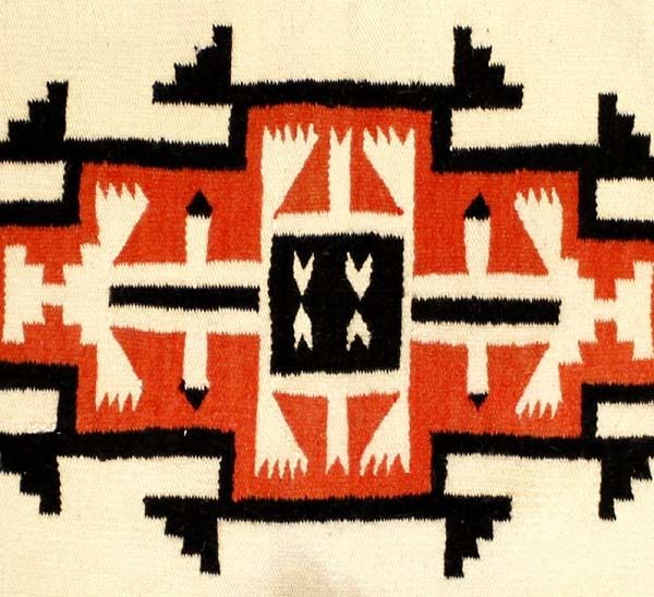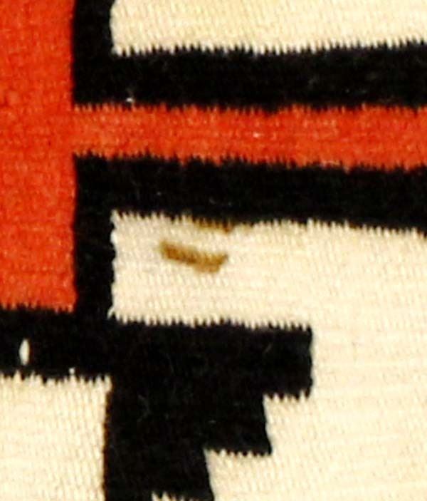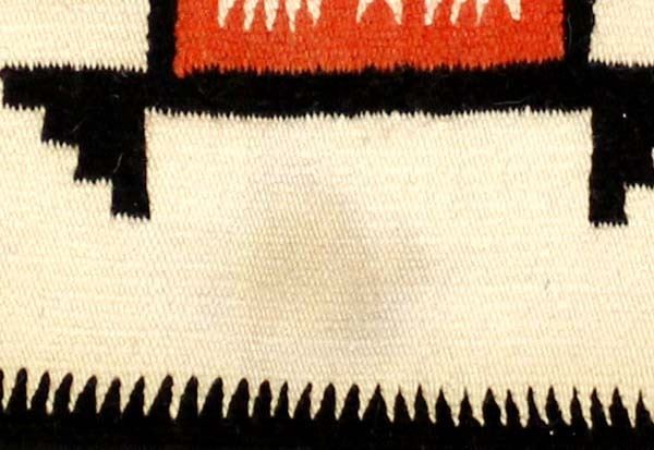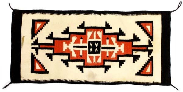 Native American Navajo Textile Rug, measures 48''L x 25.5''W, 4 cornered tassels intact, has 1''L hole and stains