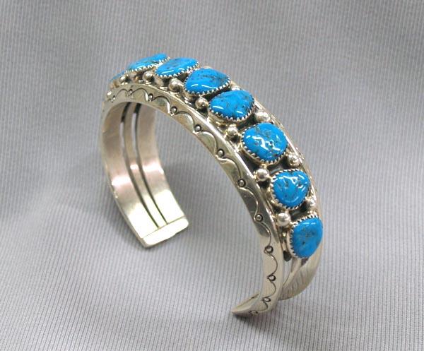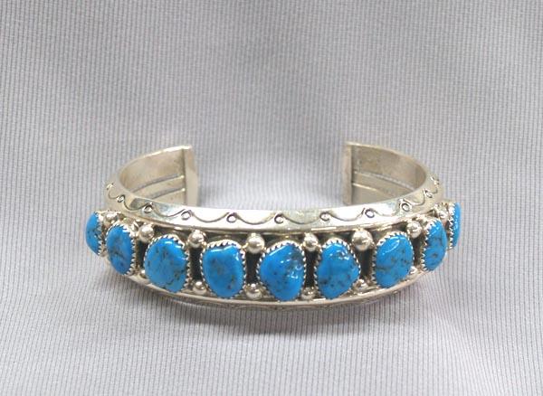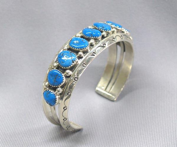 Native American Navajo Sterling Silver Turquoise Bracelet hallmarked SC, 9 stones, inside measures 7.25'', 7/8'' width, largest stone measures .5'' x 3/8''. Buyers Pay Actual Shipping and Handling Charges(see terms and conditions for more information)