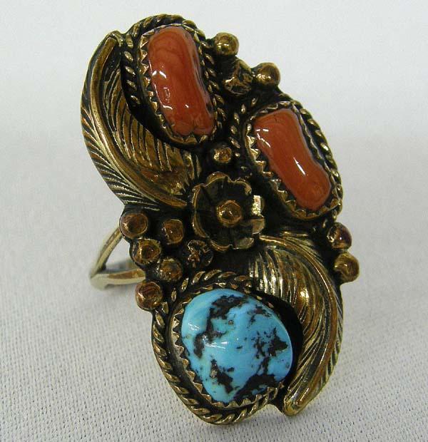 Native American Navajo Gold over Sterling Silver with Turquoise and Coral Stones by S. Lee. Approx. Size 11, center measures approx. 1.5''Hx.75''W. Buyers Pay Actual Shipping and Handling Charges(see terms and conditions for more information).