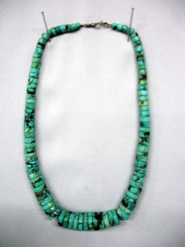 Large Hachita Graduated Turquoise Bead Necklace. Measurement in Inches - End to End is 23. The center bead is 7/8'' diameter x 1/4''. Buyers Pay Actual Shipping and Handling Charges(see terms and conditions for more information).