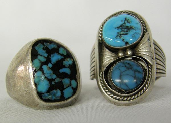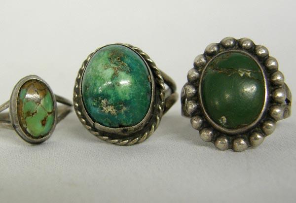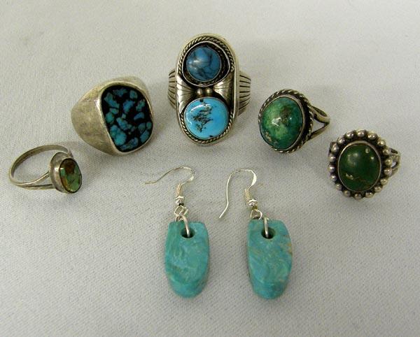 Turquoise Jewelry, 5 Rings and 1 Pr. Earrings. 2 Mens Rings Largest Ring is size 11 3/4. Smaller Man's Ring need shank soldered. Three smaller women rings are older vintage jewelry. Buyers Pay Actual Shipping and Handling Charges(see terms and conditions for more information).