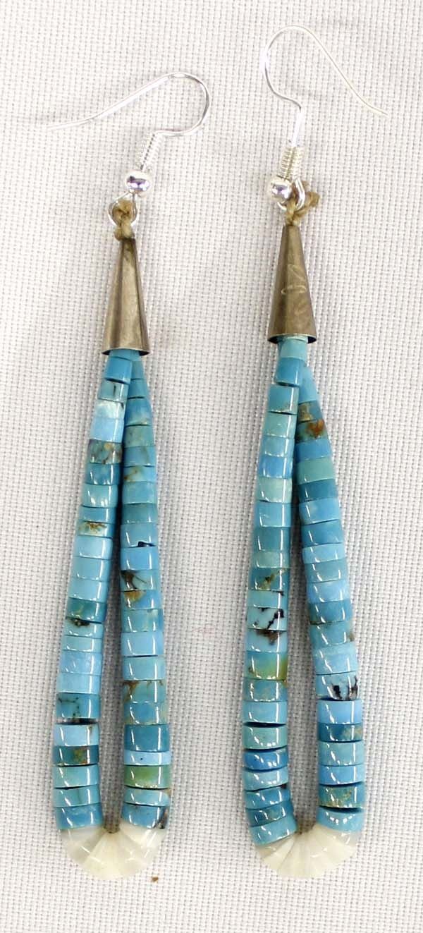 Native American Navajo Turquoise Jocla Earrings, sterling cones and white shell corn beads, measure 3''L, beautiful turquoise