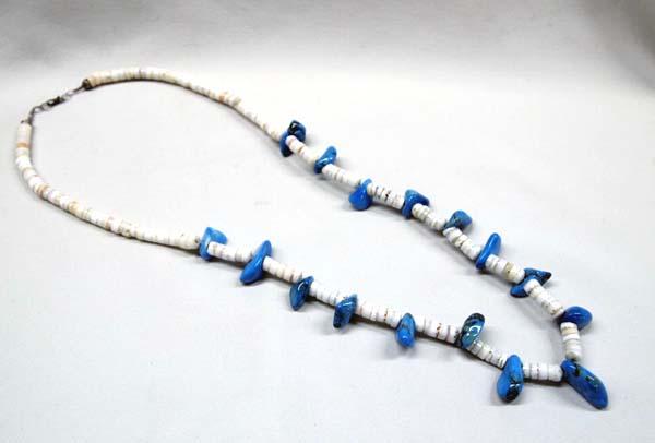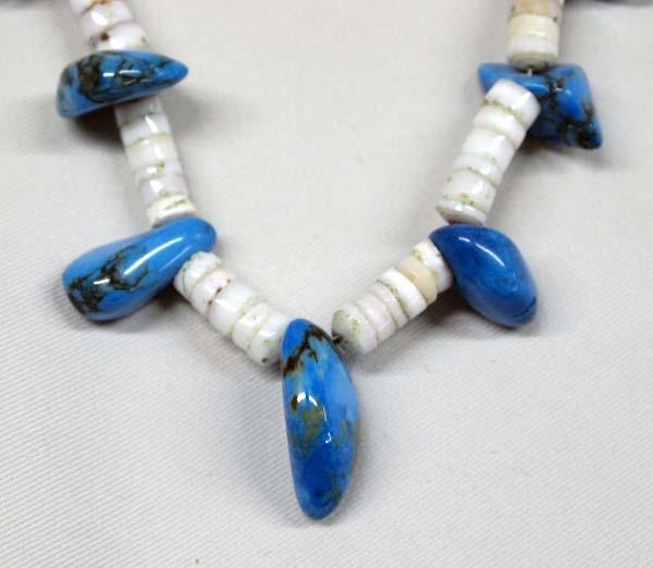 Native American Navajo Turquoise Nugget & Shell Heishi Bead Necklace. Polished Turquoise nuggets and white beads. Measures approx. 25'' long. Shell Heishi measures approx. .25"W. Largest turquoise nugget measures 1"L. Buyers Pay Actual Shipping and Handling Charges(see terms and conditions for more information).
