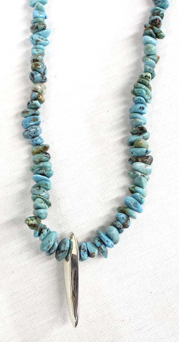 Native American Navajo Sterling & Bisbee Turquoise Nugget Pendant Necklace, measures 19''L end to end, sterling holloware pendant measures 2''L, sterling clasp and chain