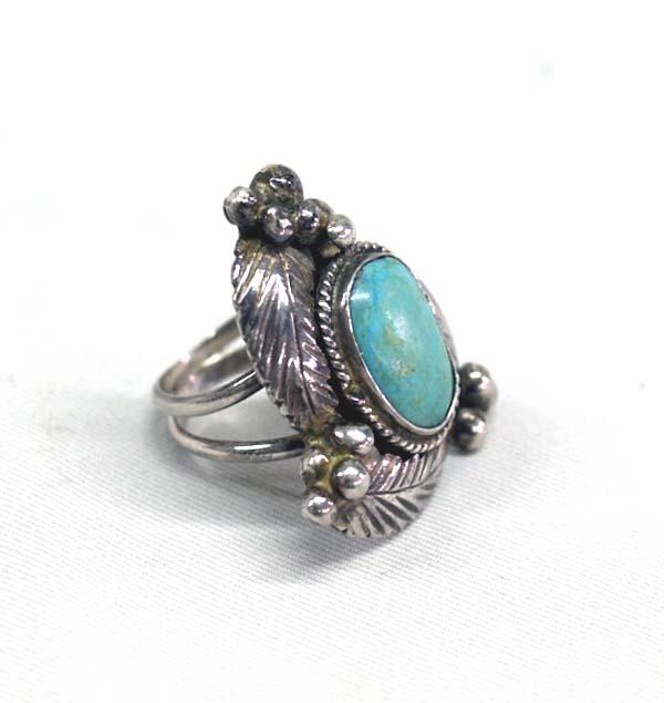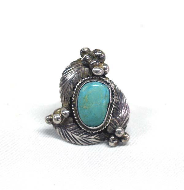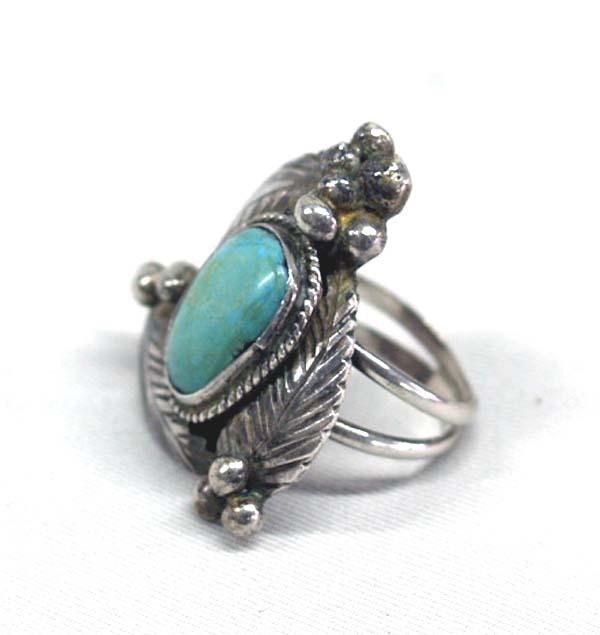Native American Navajo Turquoise Ring Size 7 1/2, feather design on sides of turquoise stone. Ring measures approx. 1 1/4''H x 1 1/4''W, stone measures approx. 5/8''H x 3/8''W. Buyers Pay Actual Shipping and Handling Charges(see terms and conditions for more information).