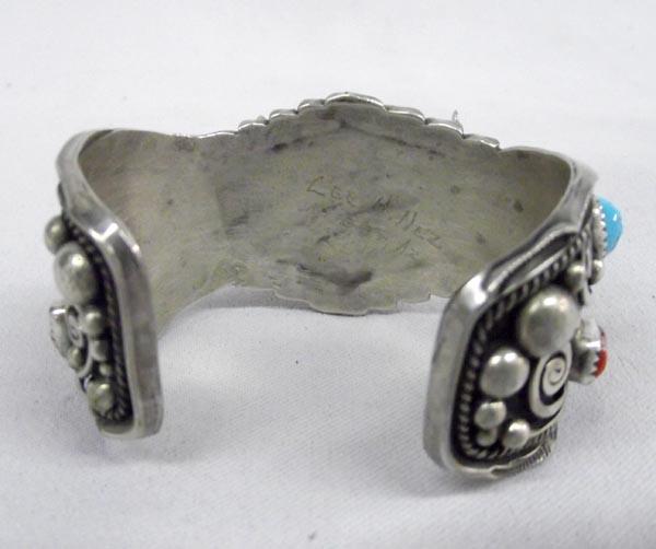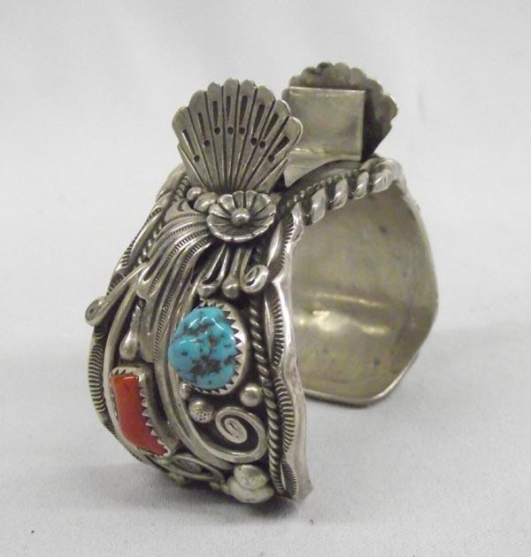 Native American Navajo Silver Turquoise Coral Watch Bracelet by Lee H. Nez Kaibeto AZ Navajo, repousse' silverwork, inside measures approx. 6'' x 1.25''W. Buyers Pay Actual Shipping and Handling Charges(see terms and conditions for more information)