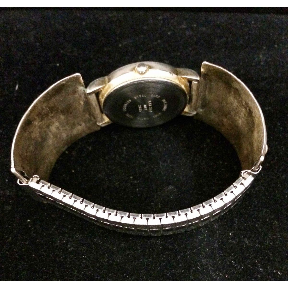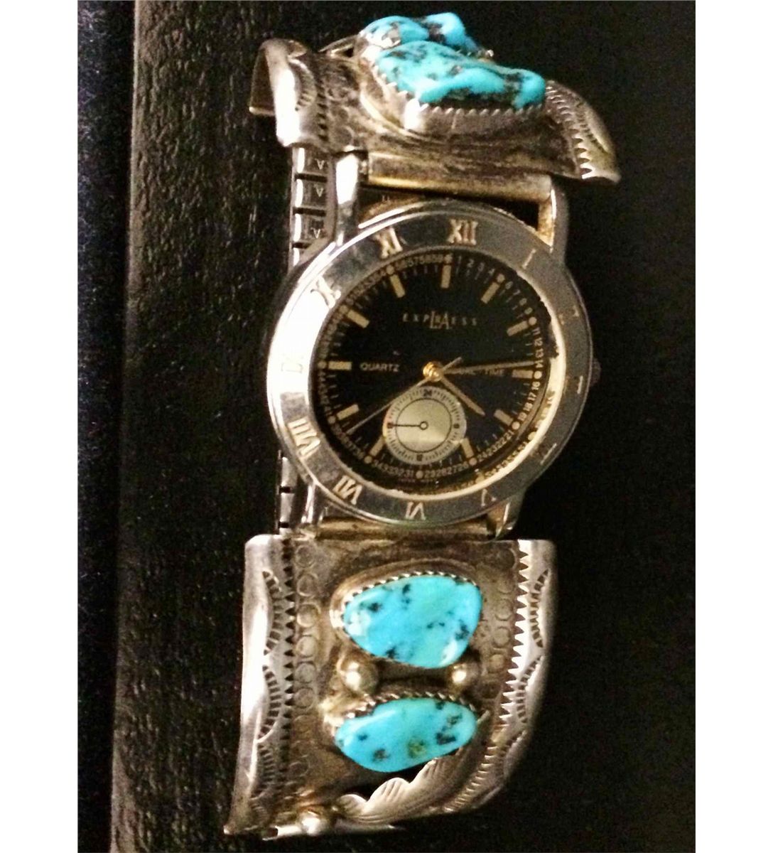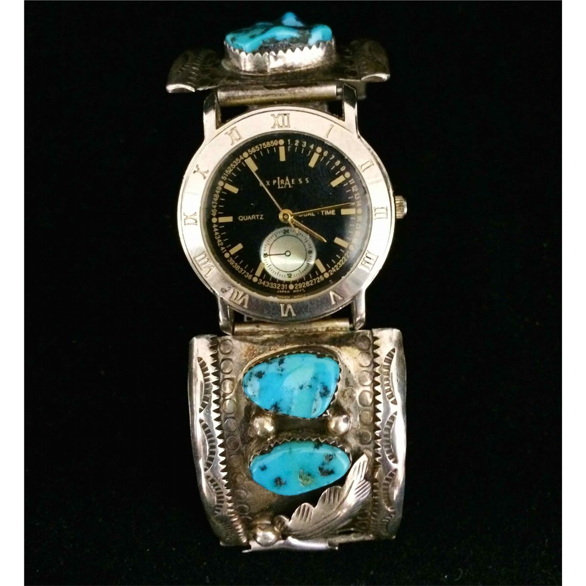 The working watch with Navajo-made tips and a stretch band. Marked Sterling and has a makers hallmark of F W.. Appears to have turquoise cabochons from the Kingman Mine.