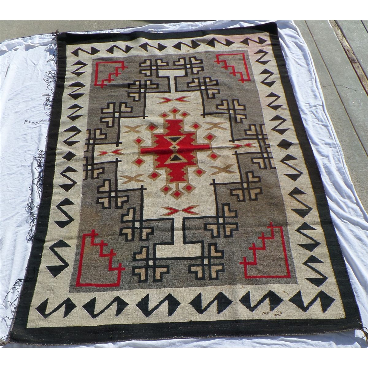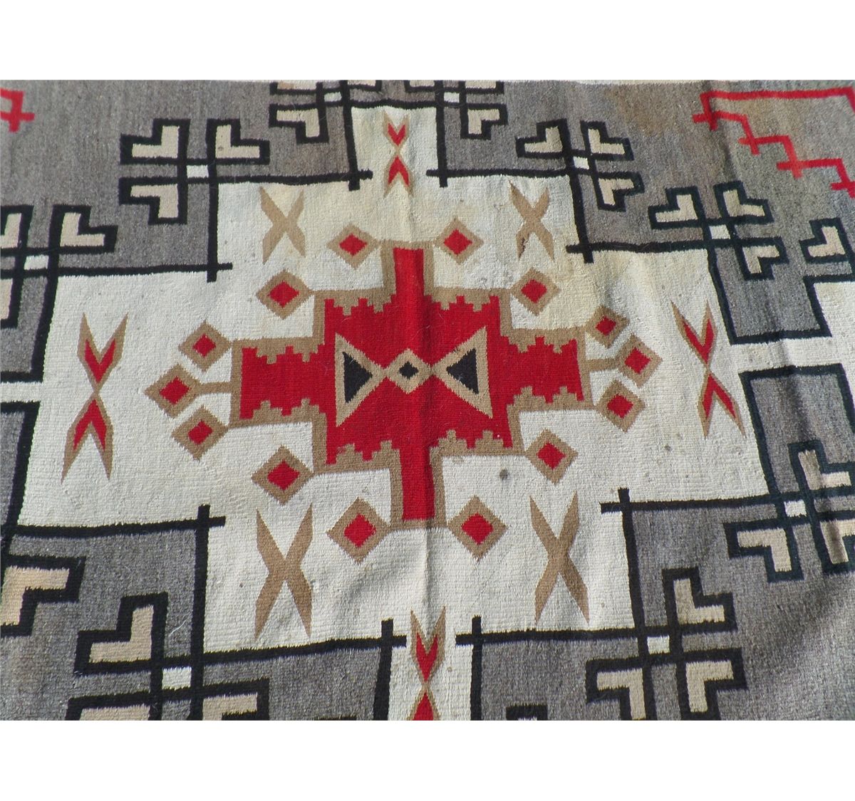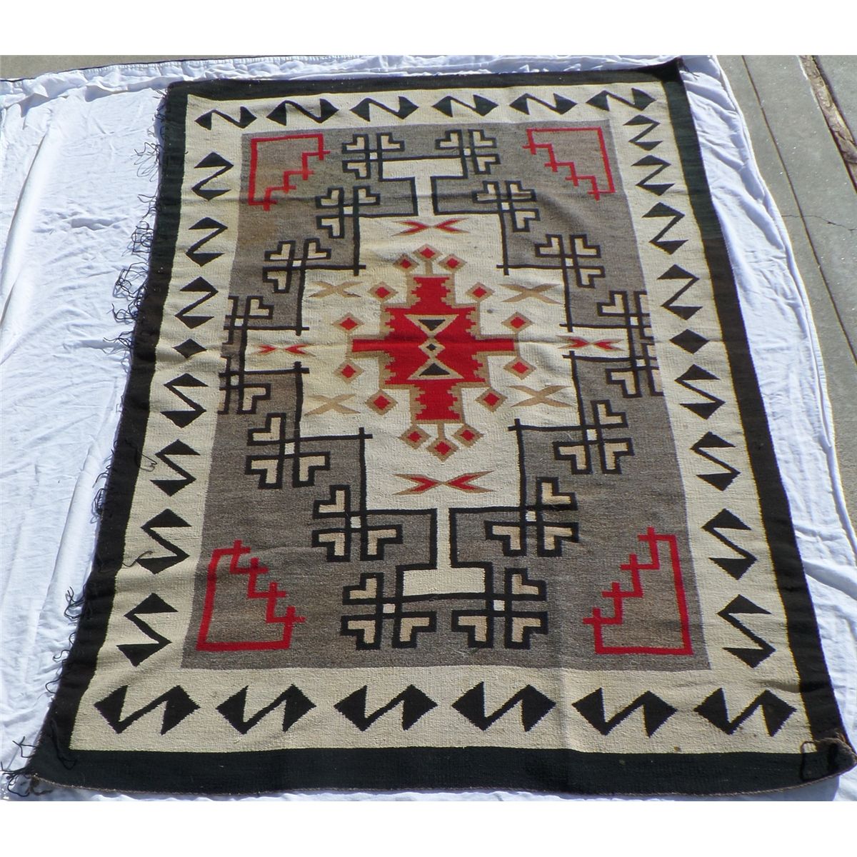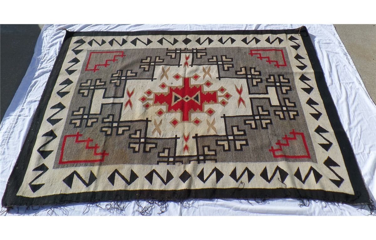 Native American Navajo Weaving measures 52.5" wide by 77.5" tall. Condition: Good w/some staining. Shipping: $30.