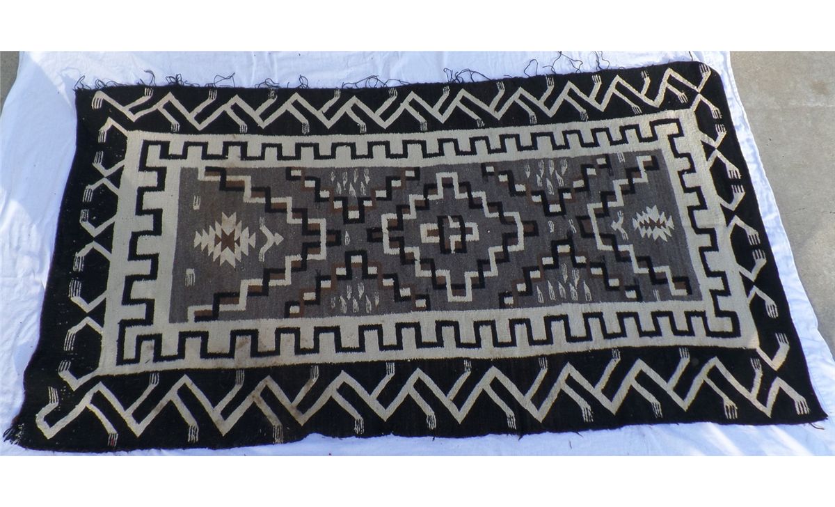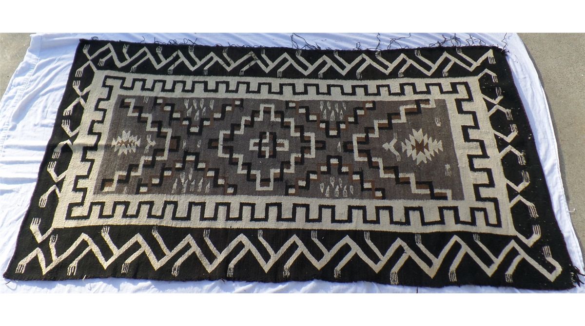 Native American Navajo Weaving measures 43.5" wide by 81" tall. Condition: Good w/some staining. Shipping: $28.