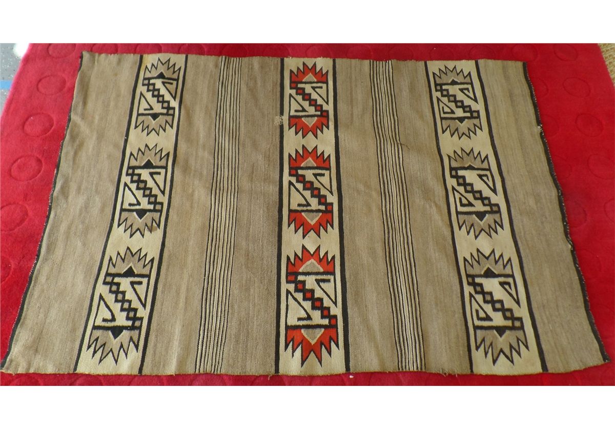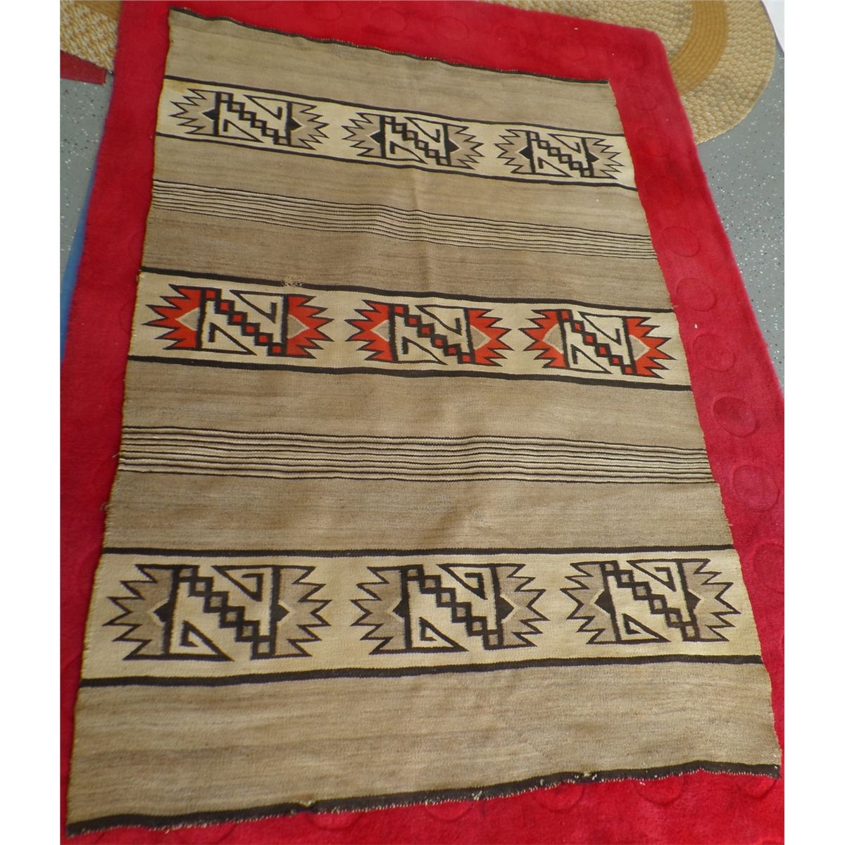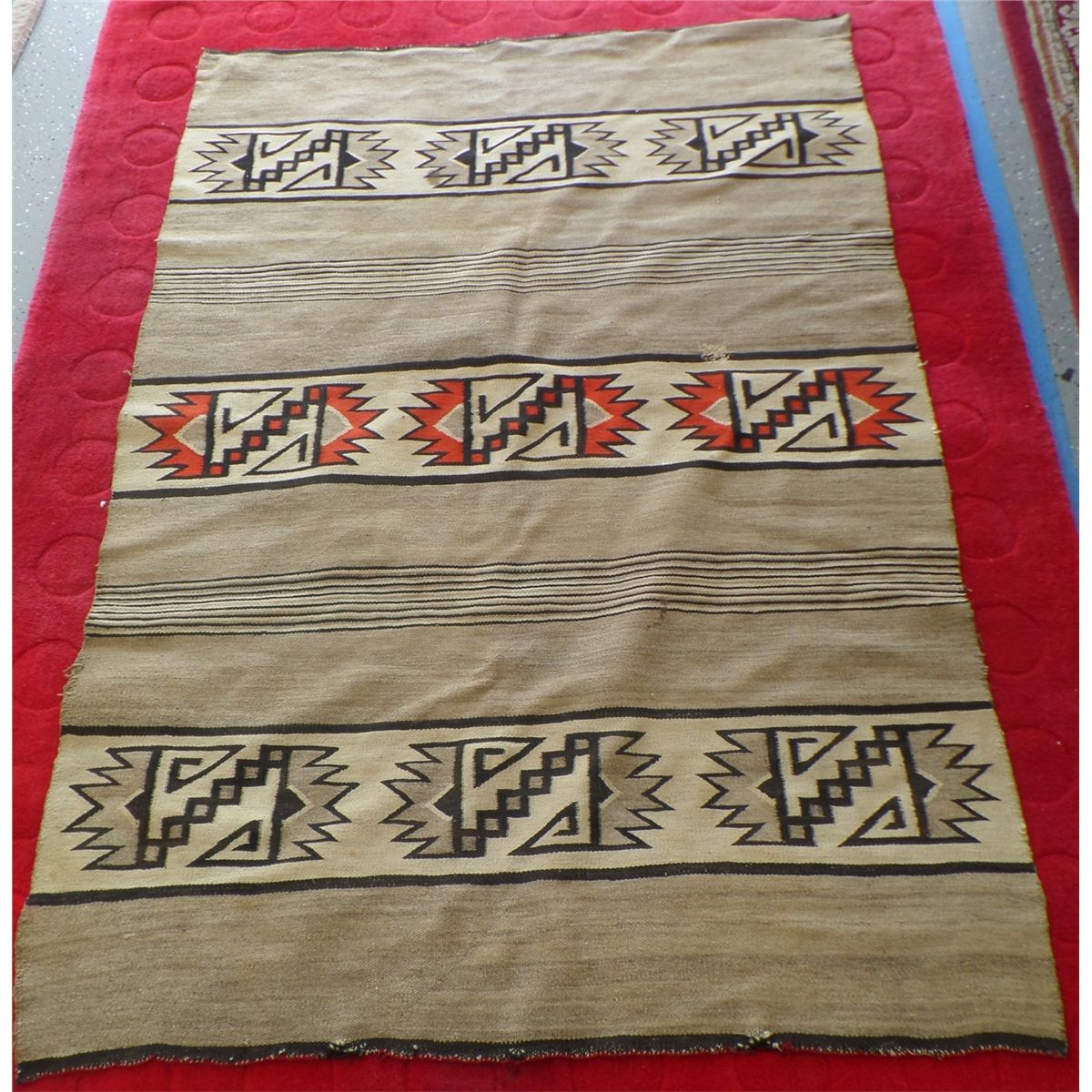 Native American Navajo Weaving measures 66" x 45". Colors include tan, orange, black and sand. Condition: Some light fraying and staining. Shipping: $24.