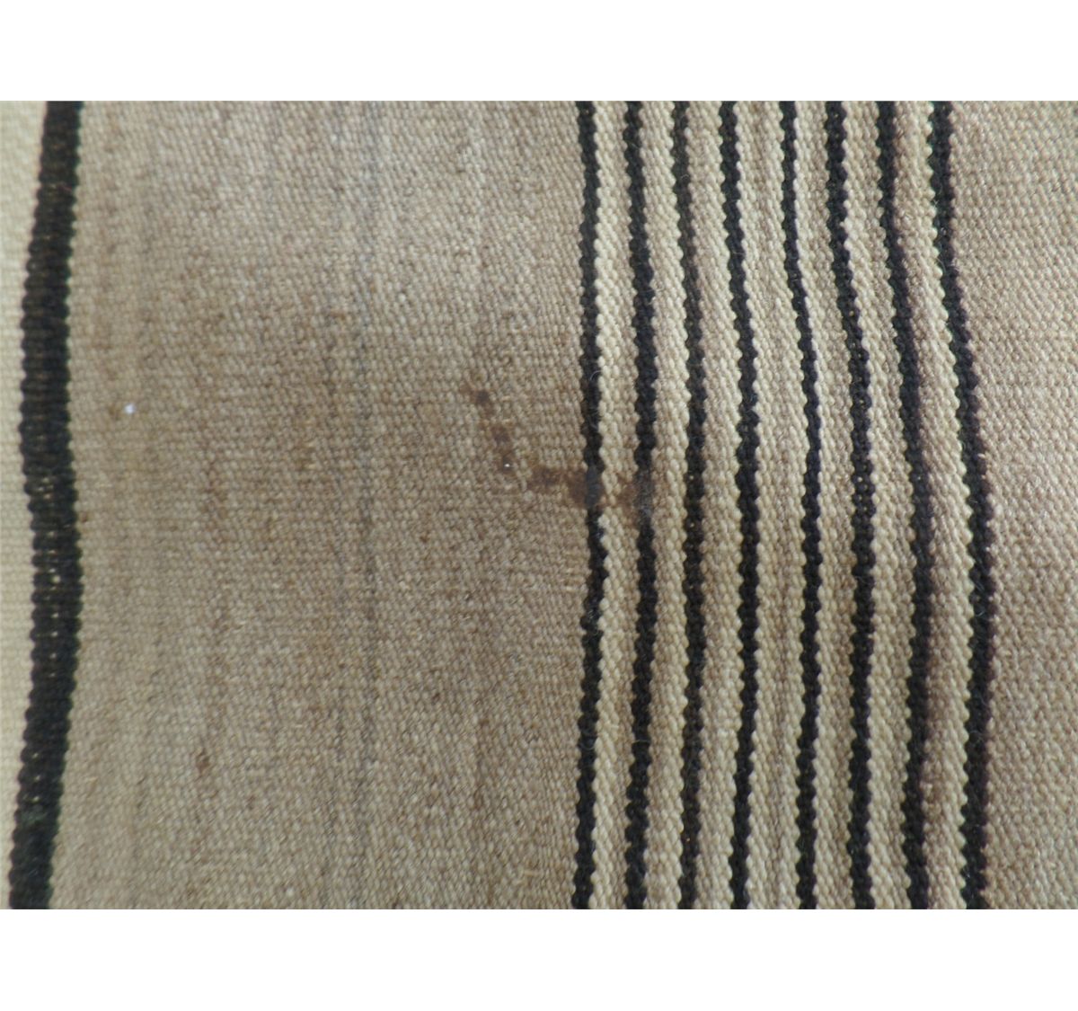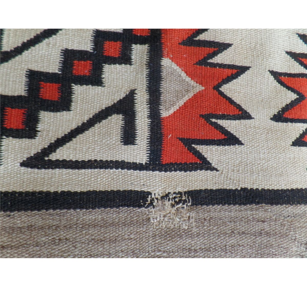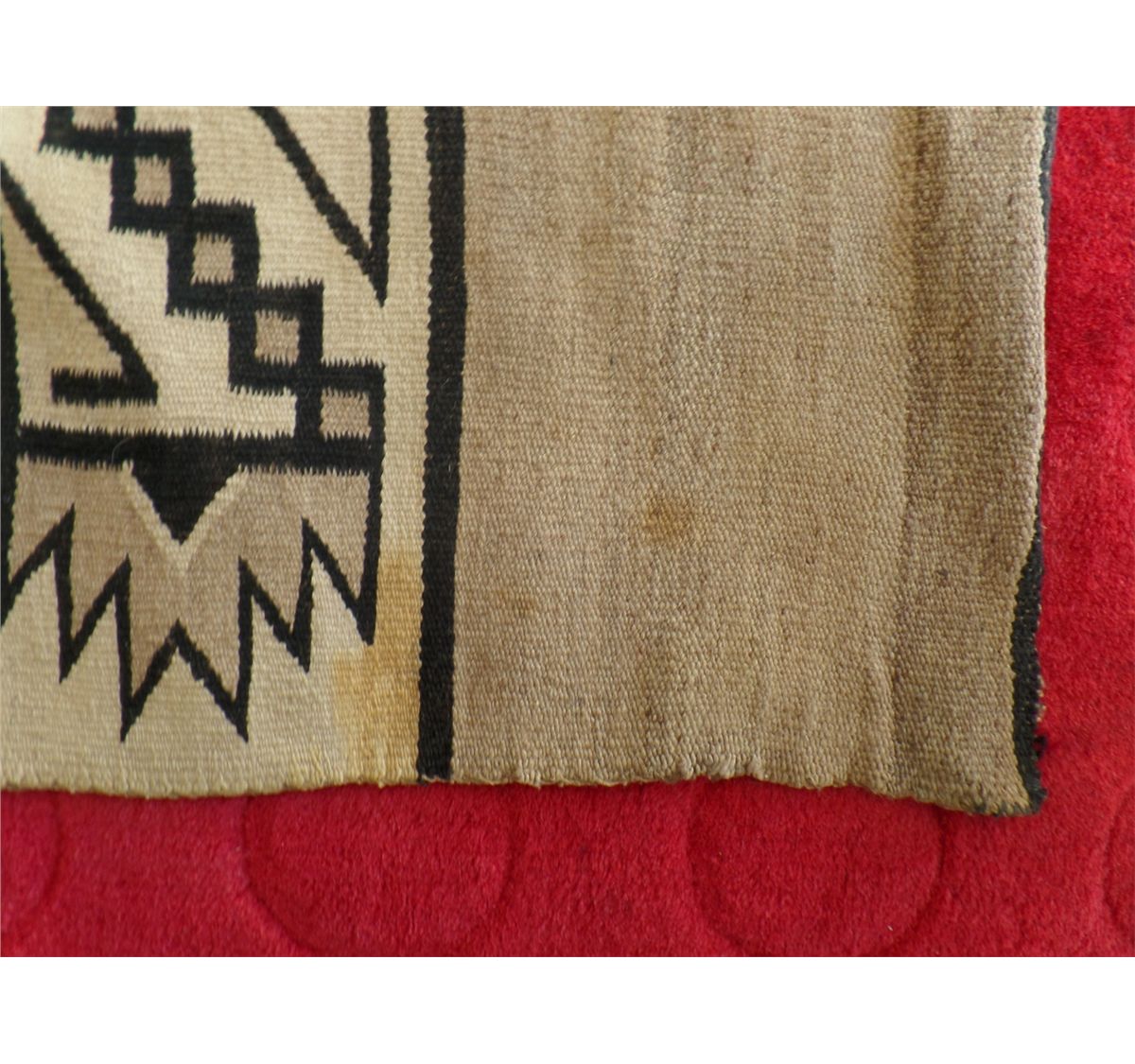 Native American Navajo Weaving measures 66" x 45". Colors include tan, orange, black and sand. Condition: Some light fraying and staining. Shipping: $24.