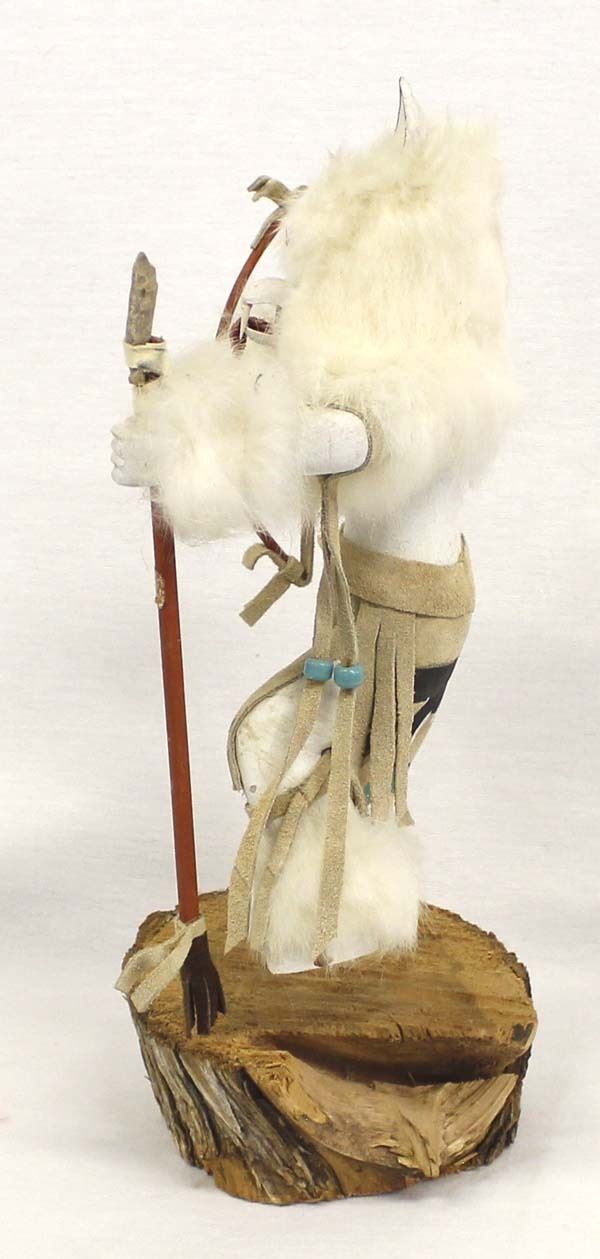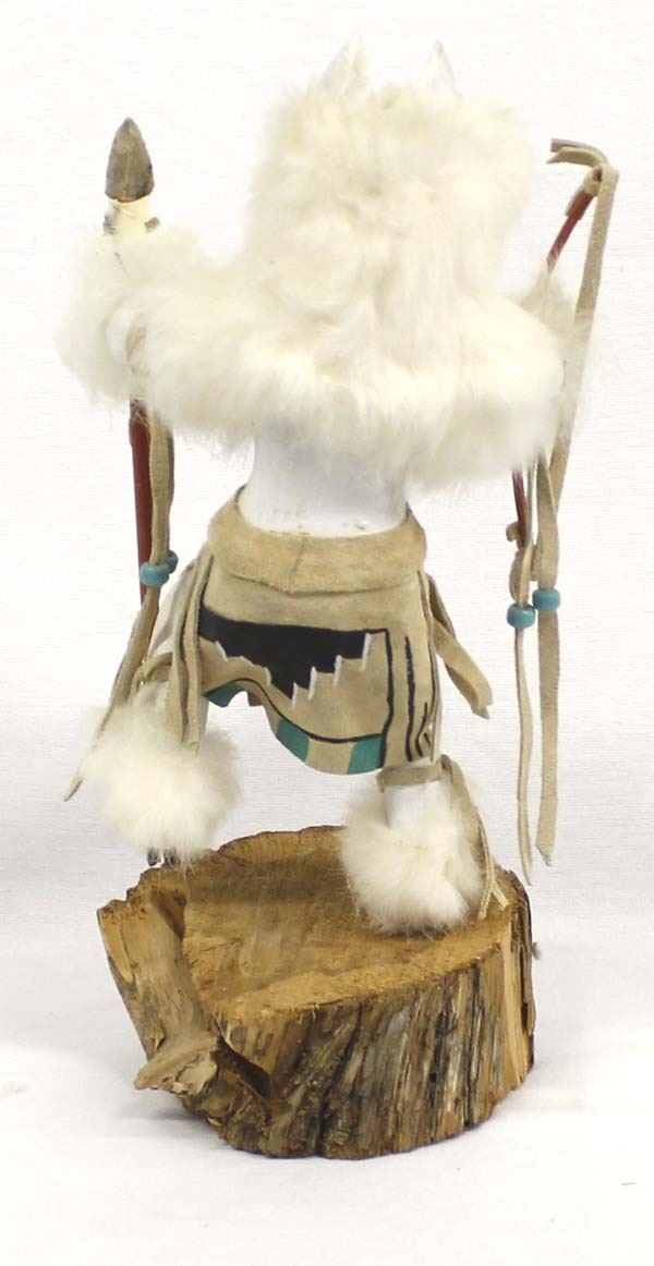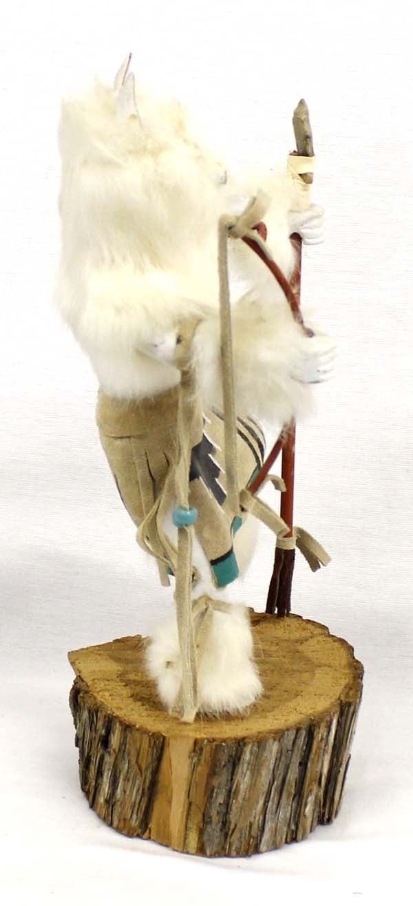 Native American Navajo Wolf Kachina by V. Calladitto, measures 6'' x 13.5'' x 5.5'' and is signed on the bottom, embellished with rabbit fur, leathers, shells, and beads