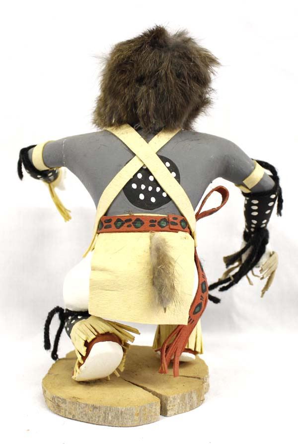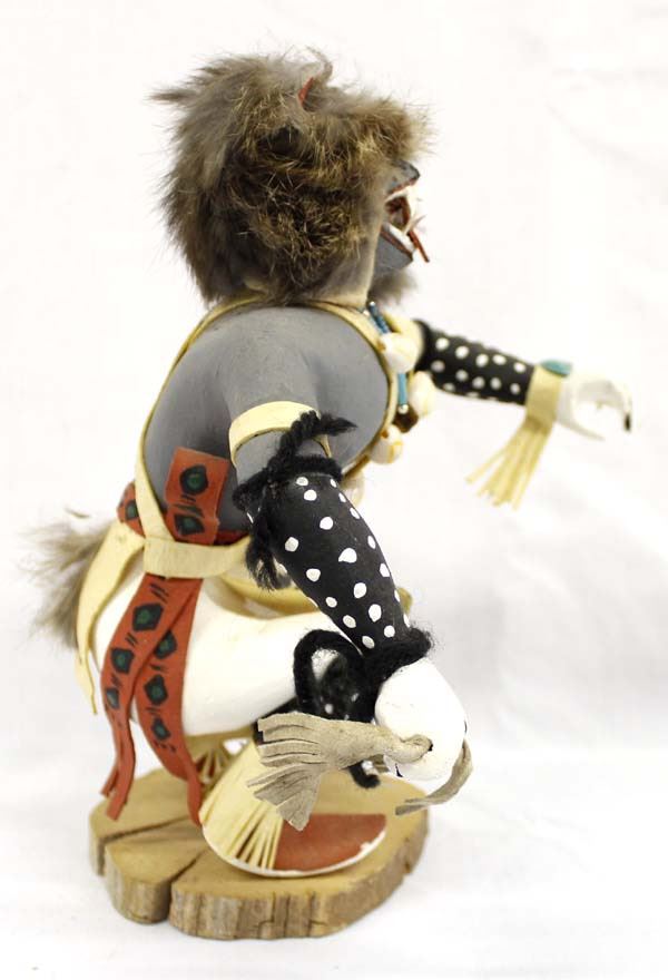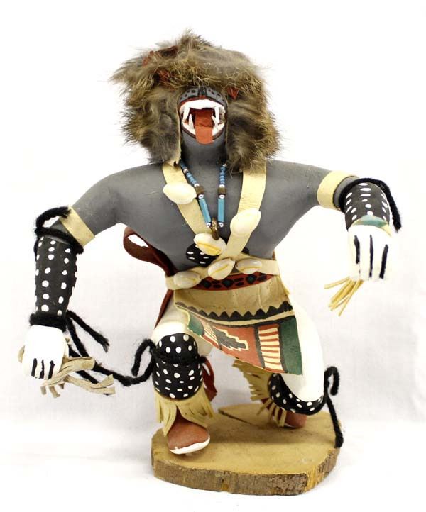 Native American Navajo Wolf Kachina by N. Helene Spencer, measures 9.5''H x 7.5''W x 6''Deep and is signed by the artist, embellished with shells, beads, leather, turquoise stone on wrist, and rabbit fur, left arm has been glued