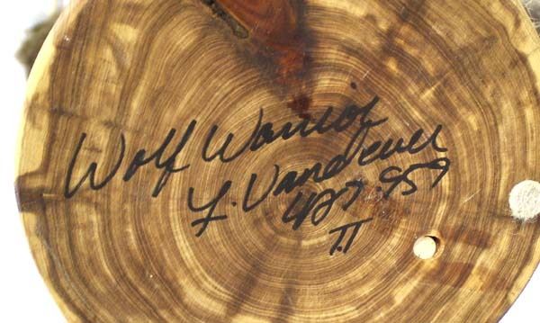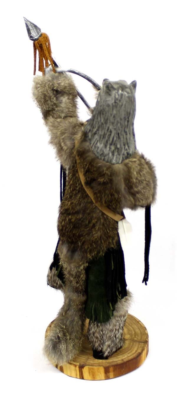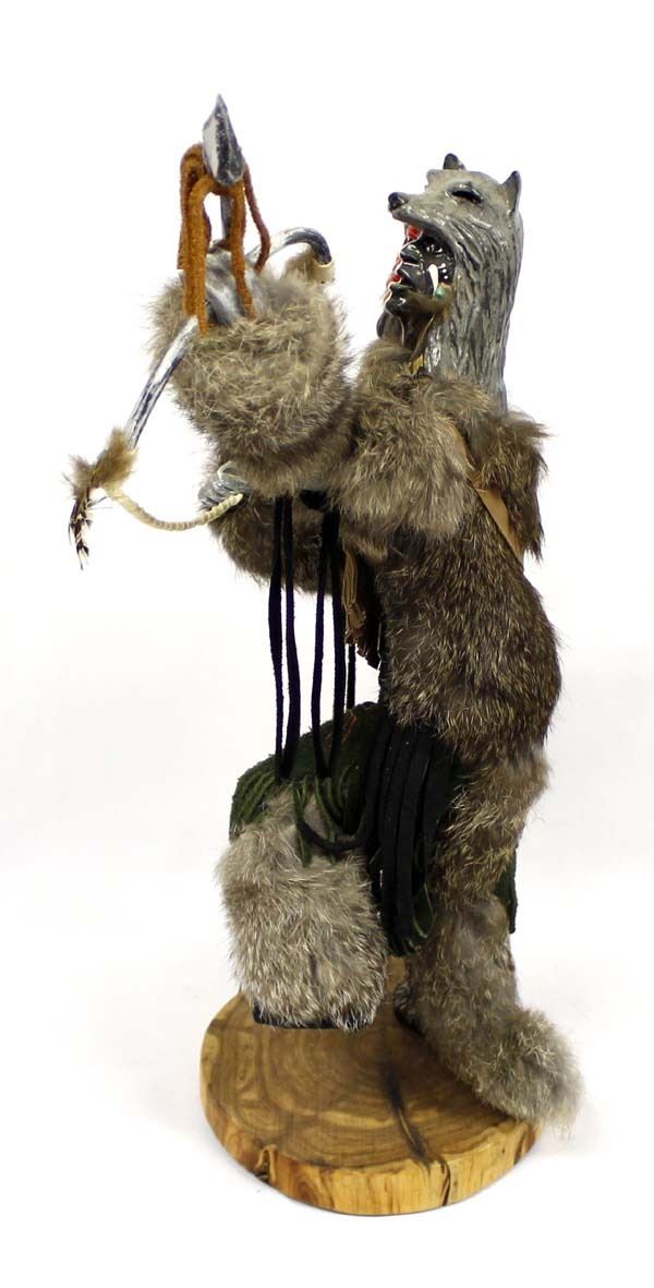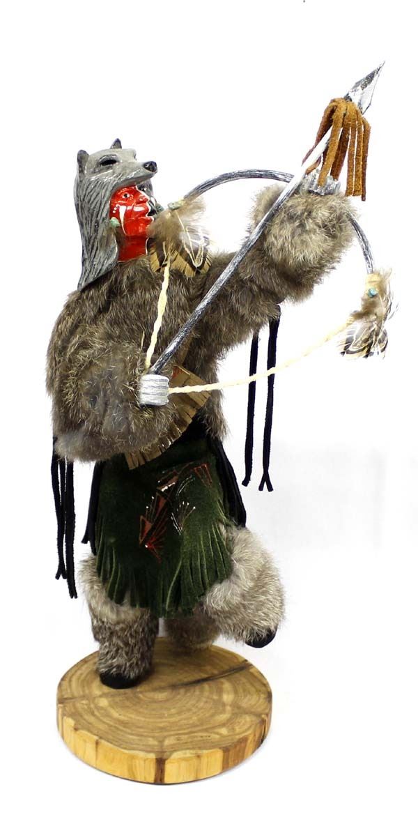 Native American Navajo Wolf Kachina by L. Vandever, measures 9'' x 16'' and is signed on the bottom, embellished with leather, rabbit fur, feathers, turquoise, and hand stamped metal concho, hand painted leather, fabulous details and well executed