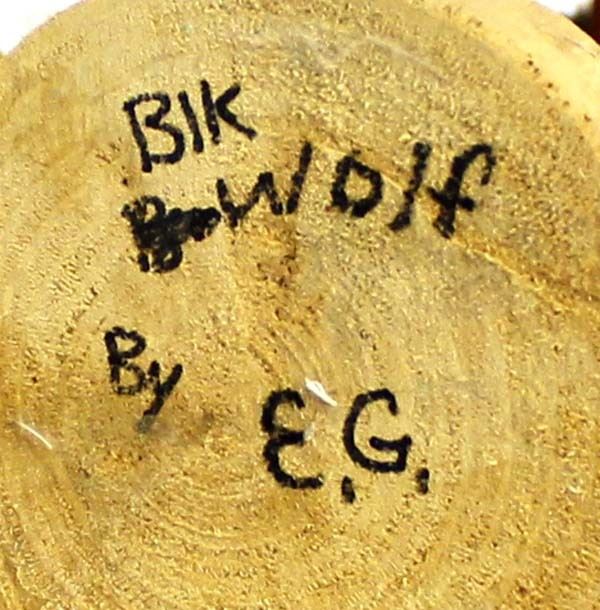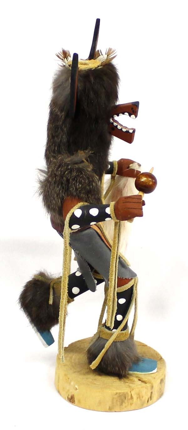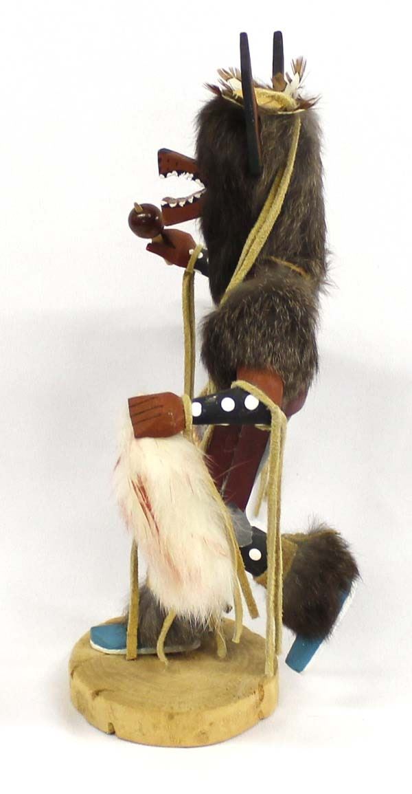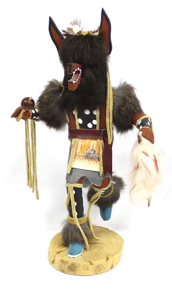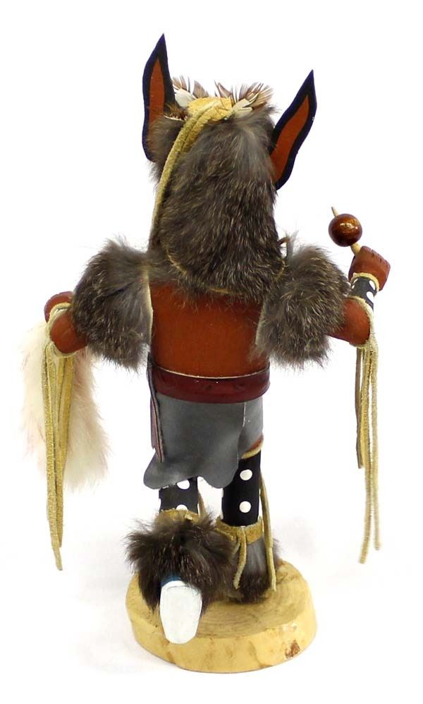 Native American Navajo Wolf Kachina, measures 12''H and has artist's initials E.G. on the bottom, embellished with rabbit fur, leather, painted canvas-like cloth, and feathers