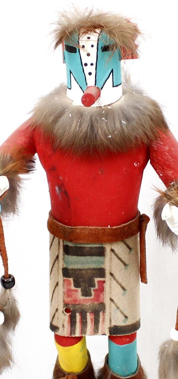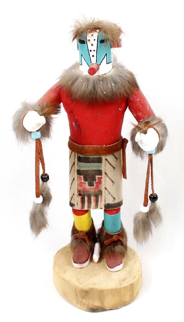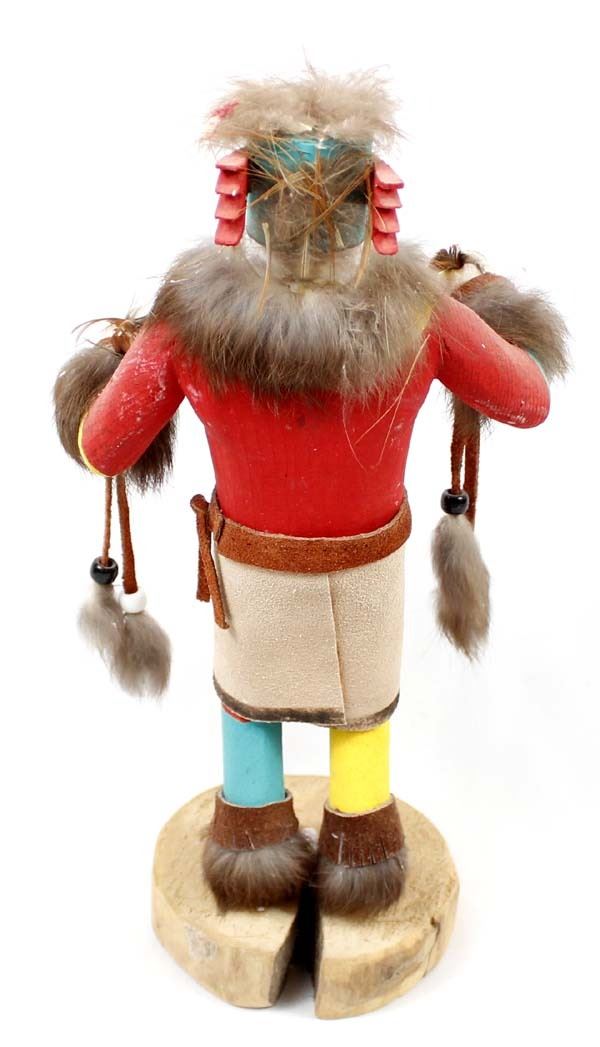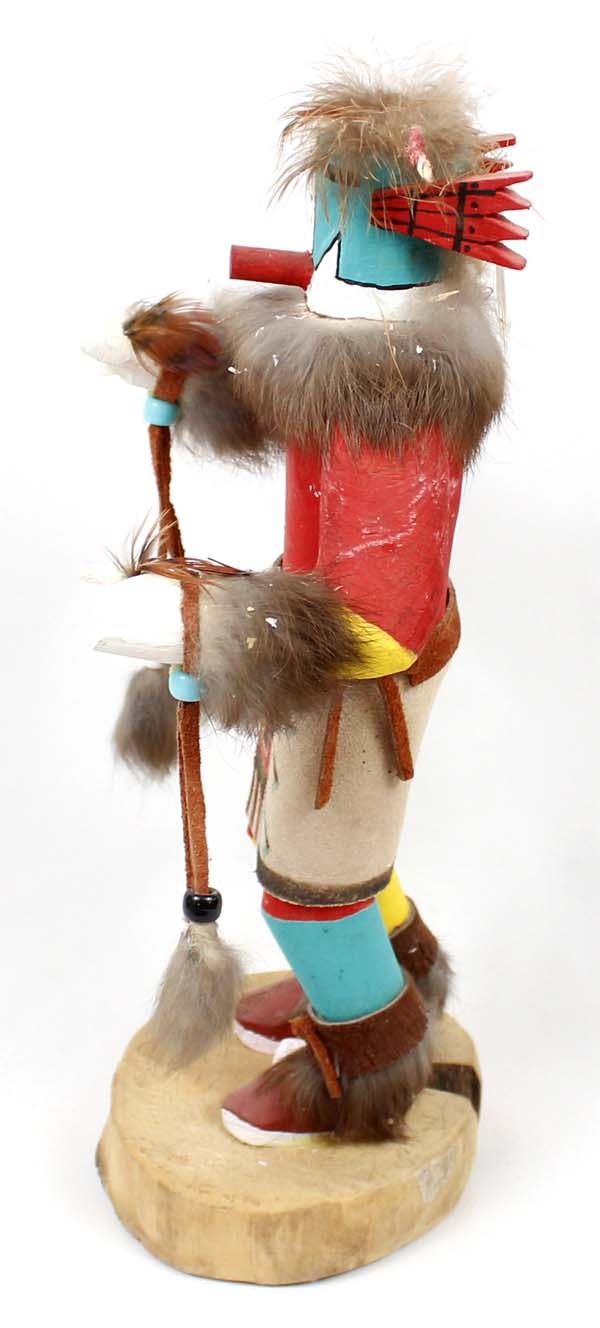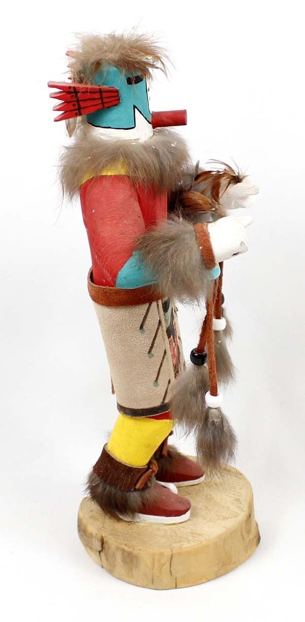Historic Native American Navajo Woodpecker Kachina, measures 5'' x 11'' x 3'' and has artist's initials on the bottom S.T., embellished with rabbit fur, feathers, beads, and leather