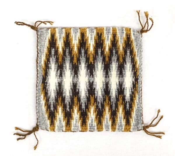 Native American Navajo Wool Textile Sampler, measures 3.75''square, 4 cornered tassels intact, beautiful colors and serrated diamond pattern