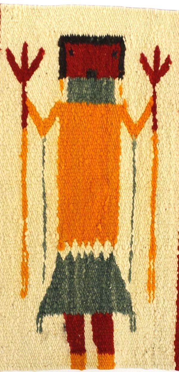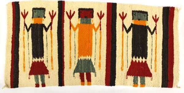 Vintage Native American Navajo Yei Bei Chei Textile Rug, measures 17'' x 36'', 4 corner tassels intact, normal wear and tear for age, some pulled threads