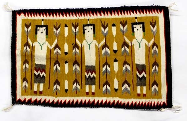 Vintage Native American Navajo 3 Yei Wool Textile Rug by Martha Benally (Chinle, Arizona), measures 23'' x 36'', stunning colors, nice tight weave, 4 cornered tassels intact