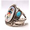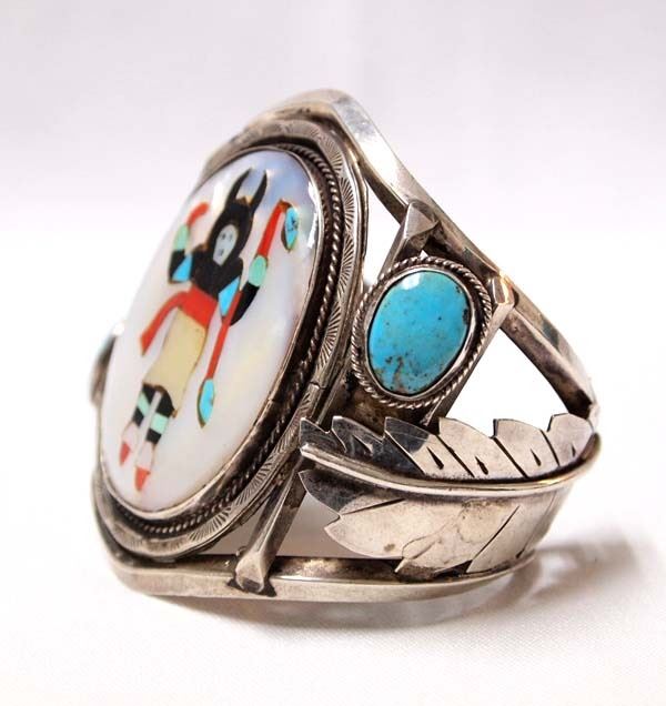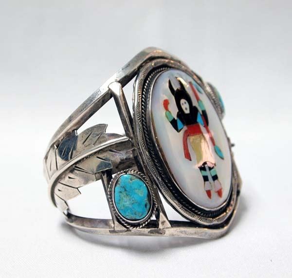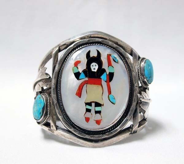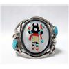 Native American Navajo & Zuni Inlay Bracelet, the channel inlay Buffalo Dancer center is Zuni made while the sterling silver and turquoise cuff is Navajo made, largest turquoise cabochons measures 5/8''L, inside measures 7'' which includes opening x 2.75''W with a total wt. of 93.82g