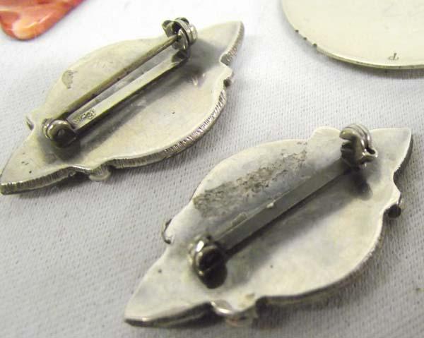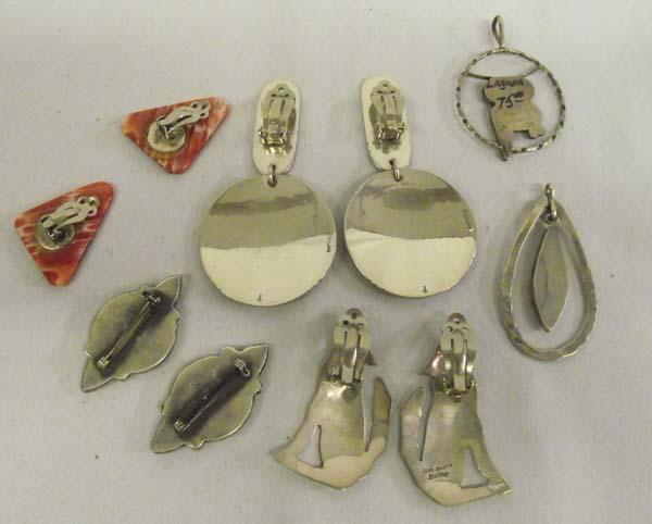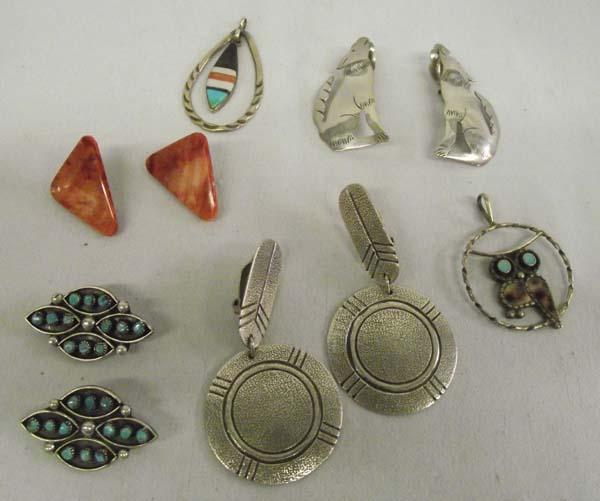 Native American Navajo, Zuni Jewelry. 2 Pendants, 2 pins, 3 pair earrings (clip ons). One of the turquoise scatter pins has the clasp broken off. Coyote earrings hallmarked Juan Guerro Sterling. Buyers Pay Actual Shipping and Handling Charges(see terms and conditions for more information)