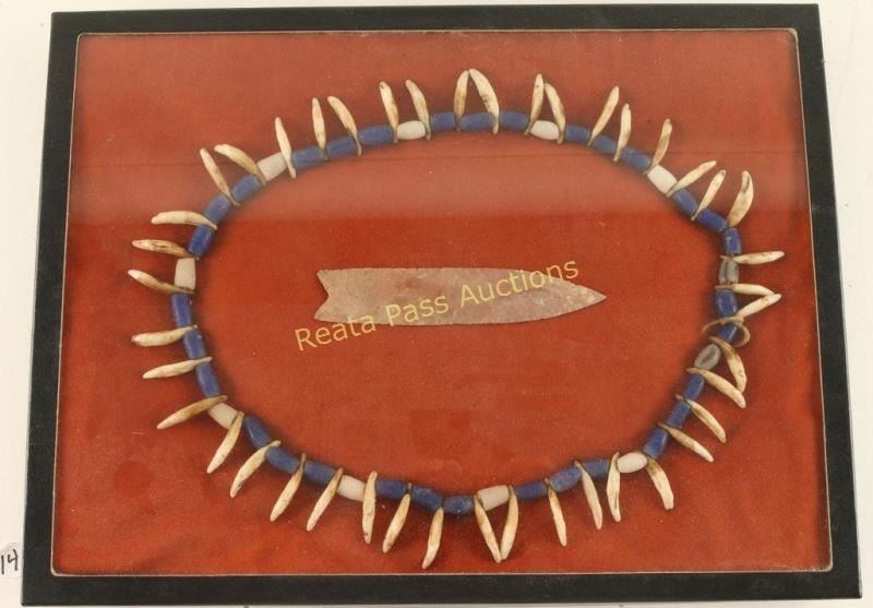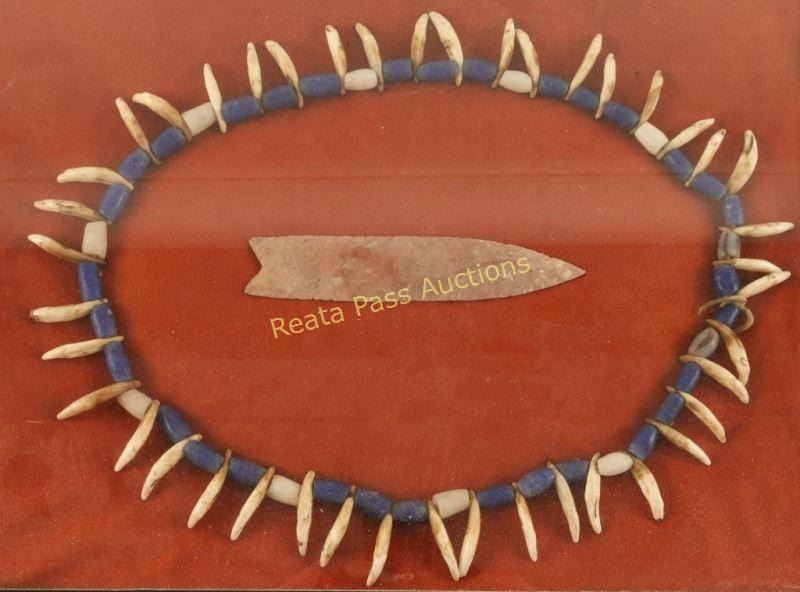 Coyote teeth and blue and white beads surround a spear point in a Riker case with a burnt orange fabric background. Unknown age or origin. Offered "as is", we don't guarantee the authenticity of this item, please do your research. All sales are final.