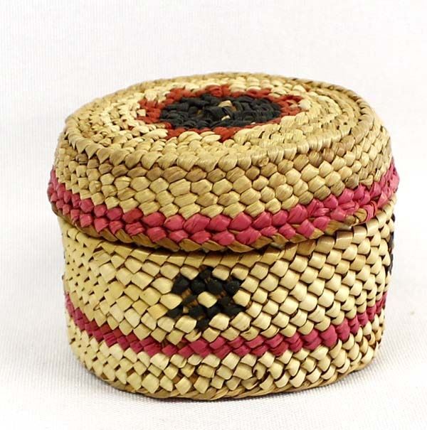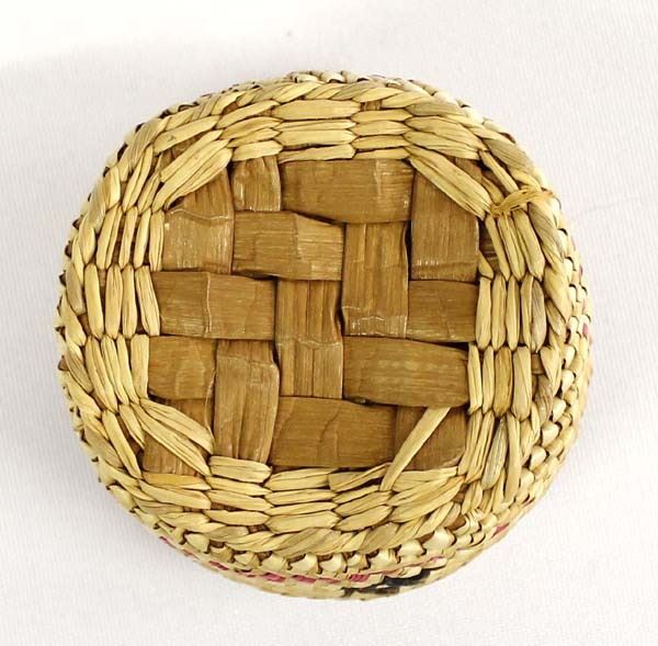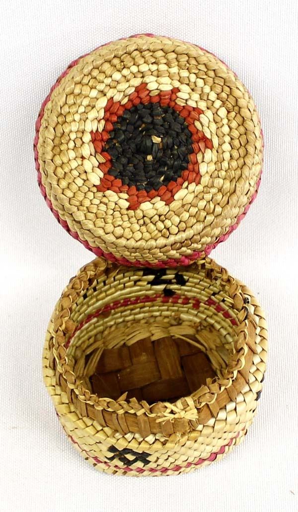 Native American Nootka Lidded Basket, measures 2.5'' x 2'', sun motif
