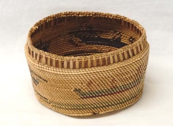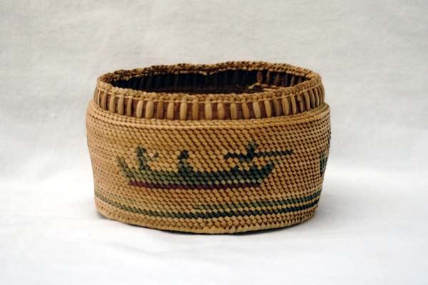 Native American Northwest Coast Makah Pictorial Basket, measures 4'' x 4'', features Whaling Boats and Hunters, Spectacular Neah Bay, Washington: home to the Makah Tribe