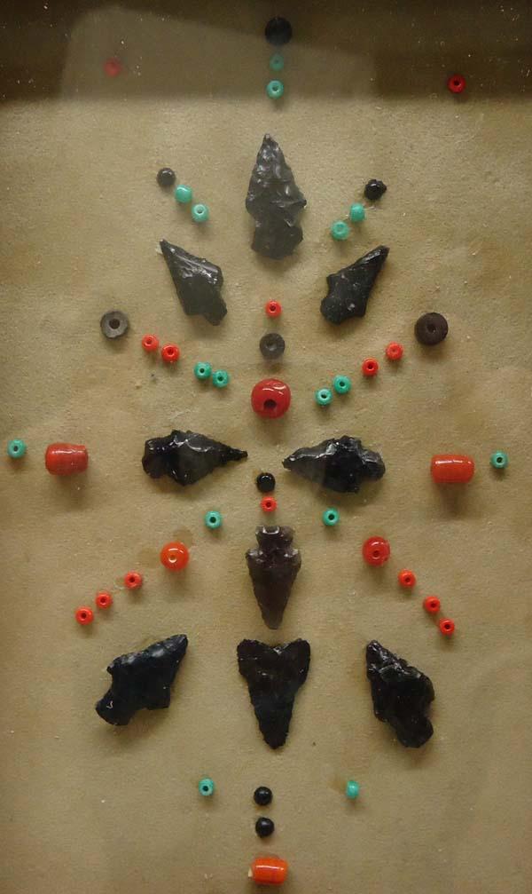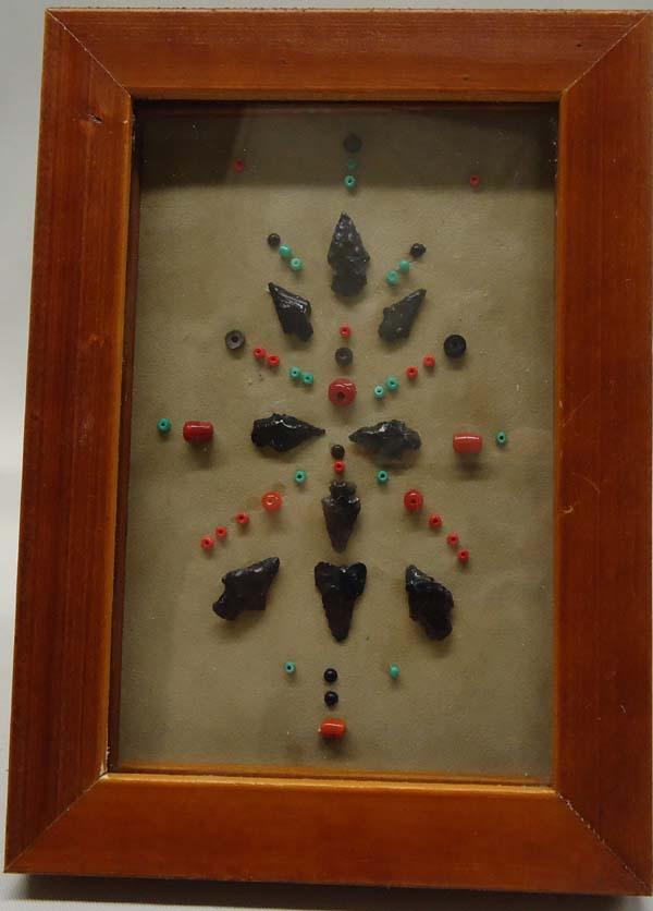 9 Framed Obsidian Arrowhead Display with beads, framed in a wood frame, under glass. Visual measures approx. 5 1/2'' x 3 3/4''. Buyers Pay Actual Shipping and Handling Charges(see terms and conditions for more information).