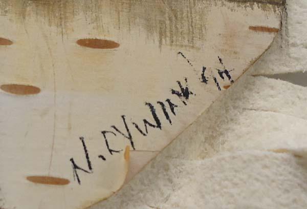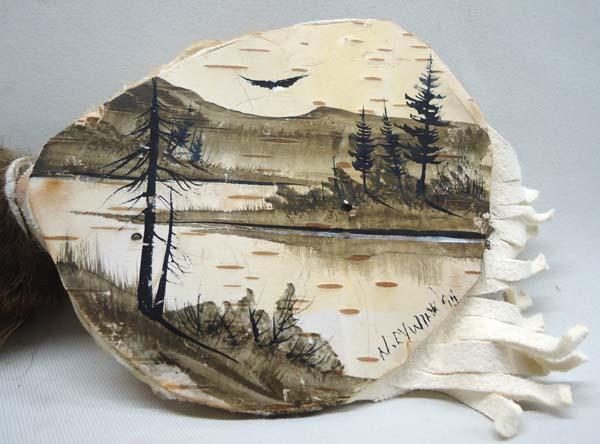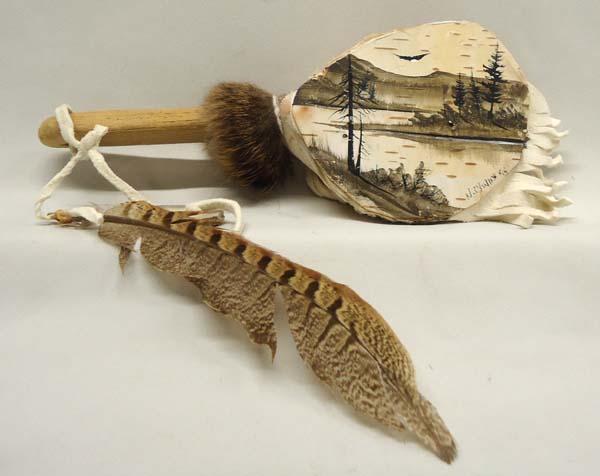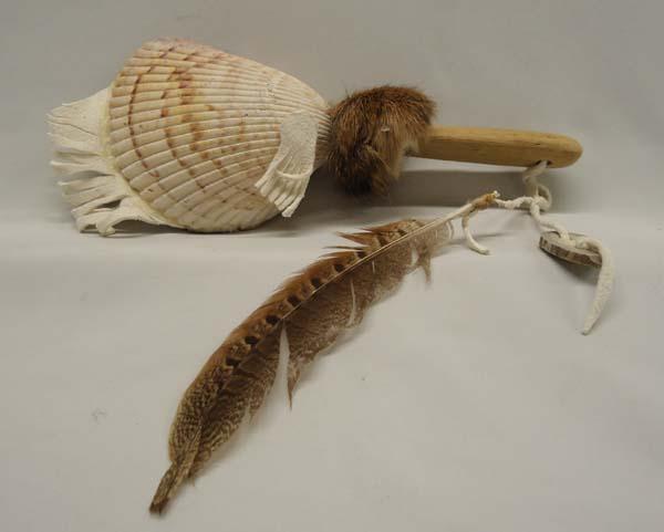 Native American Ojibwa Shell Rattle By Nick Cywink. Ojibwa (Anishinabe) rattle, shell, antler, wood, feather and leather. Painting of lake scene on leather. Rattle measures approx. not including feather 8''L x 3 1/3''W. Buyers Pay Actual Shipping and Handling Charges(see terms and conditions for more information).