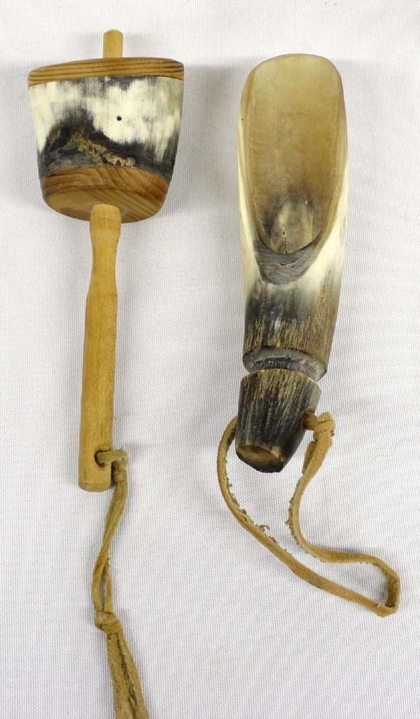 Native American Onondaga Horn Scoop and Rattle, longest is the rattle measuring 2'' x 6''