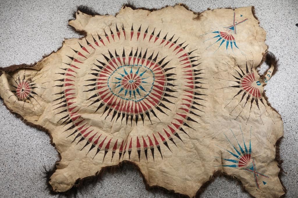 Decorated with painted and markered sunburst design. Measures 97" x 59". Turn of the century type. In overall good condition. Would make a great wall decoration. Includes The Sherman Holbert Buy Back guarantee of value at $950.00,