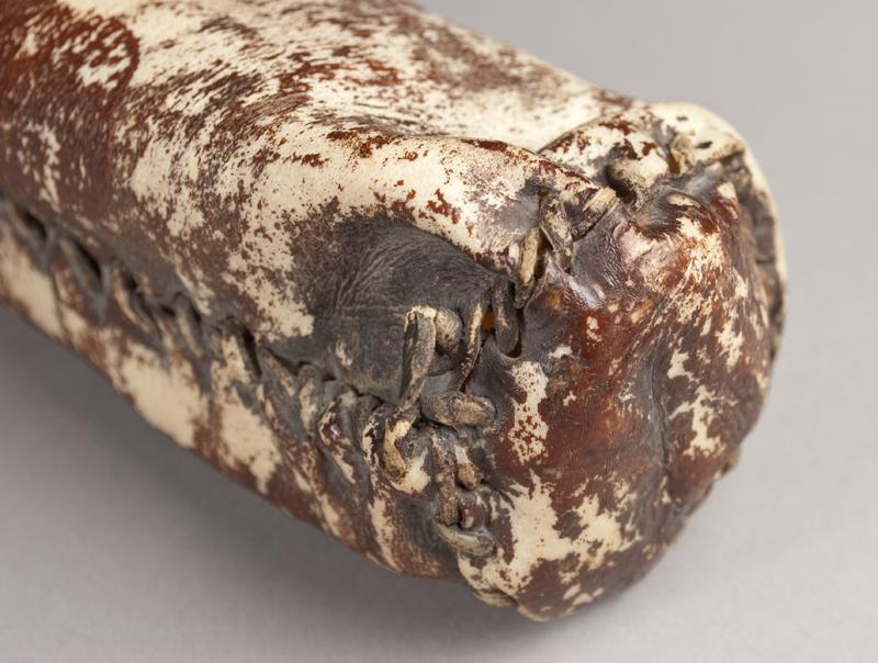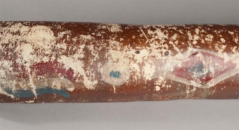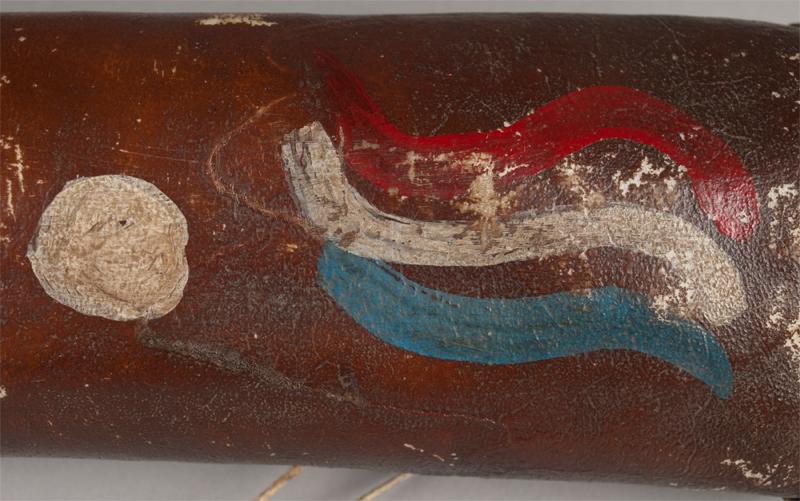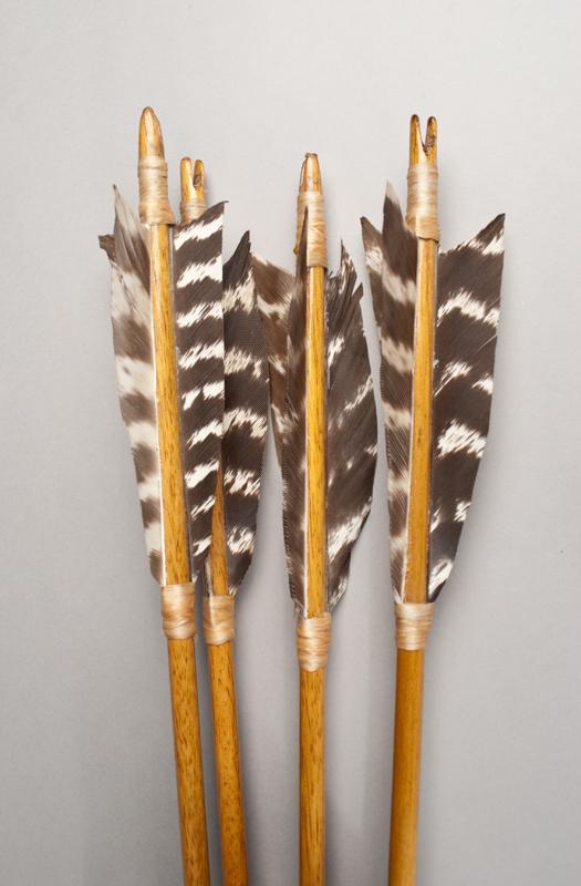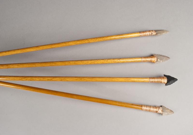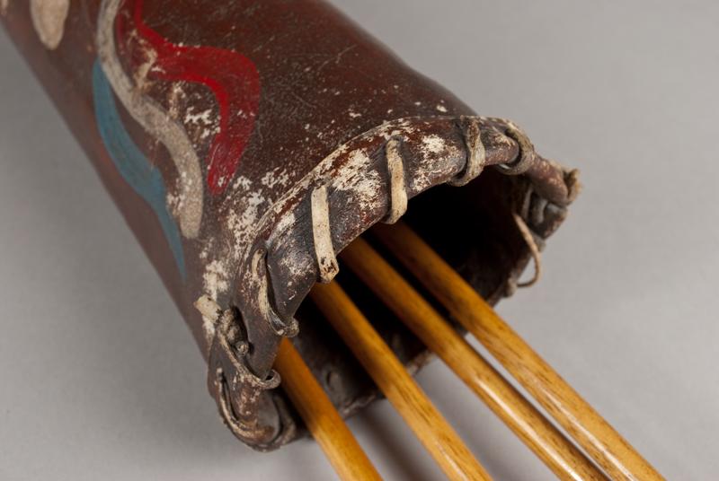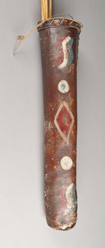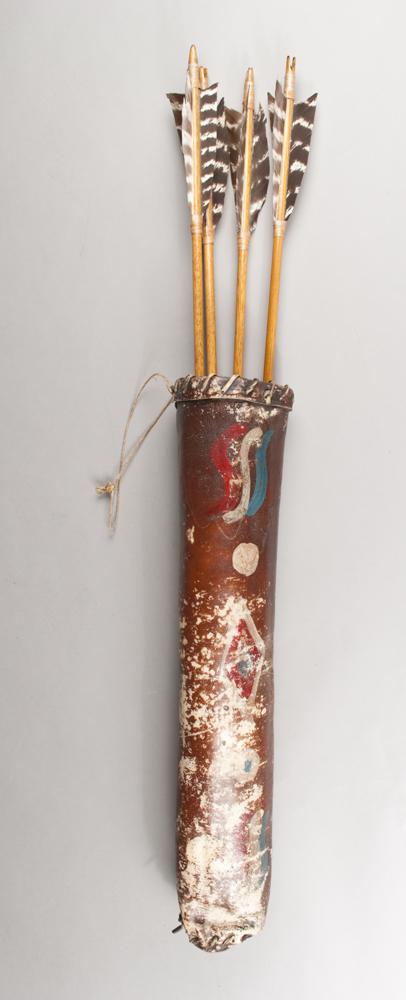 Probably apache, with four reproduction wood, stone and feather arrows, original paint decoration, quiver 19.5"H, circa 1920