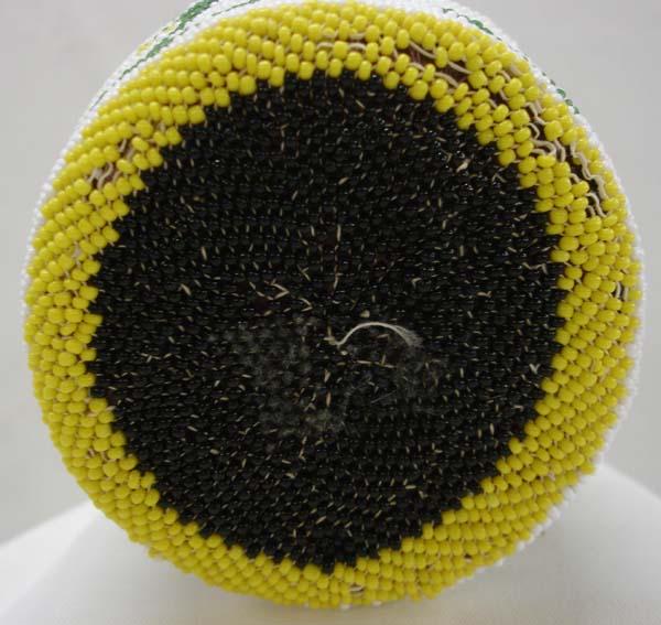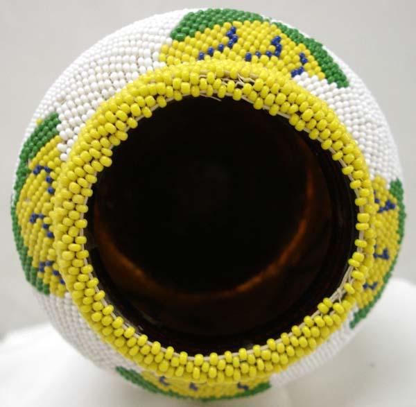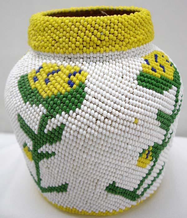 Native American Paiute Fully Beaded Jar, yellow purple green and white beads, floral design, measures approx. 4''Diameter x 4.5''H. Buyers Pay Actual Shipping and Handling Charges(see terms and conditions for more information)
