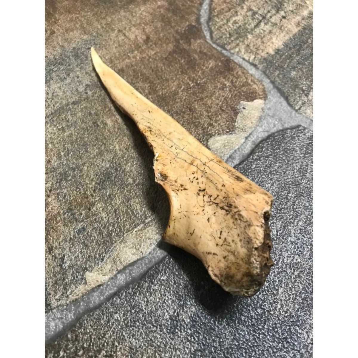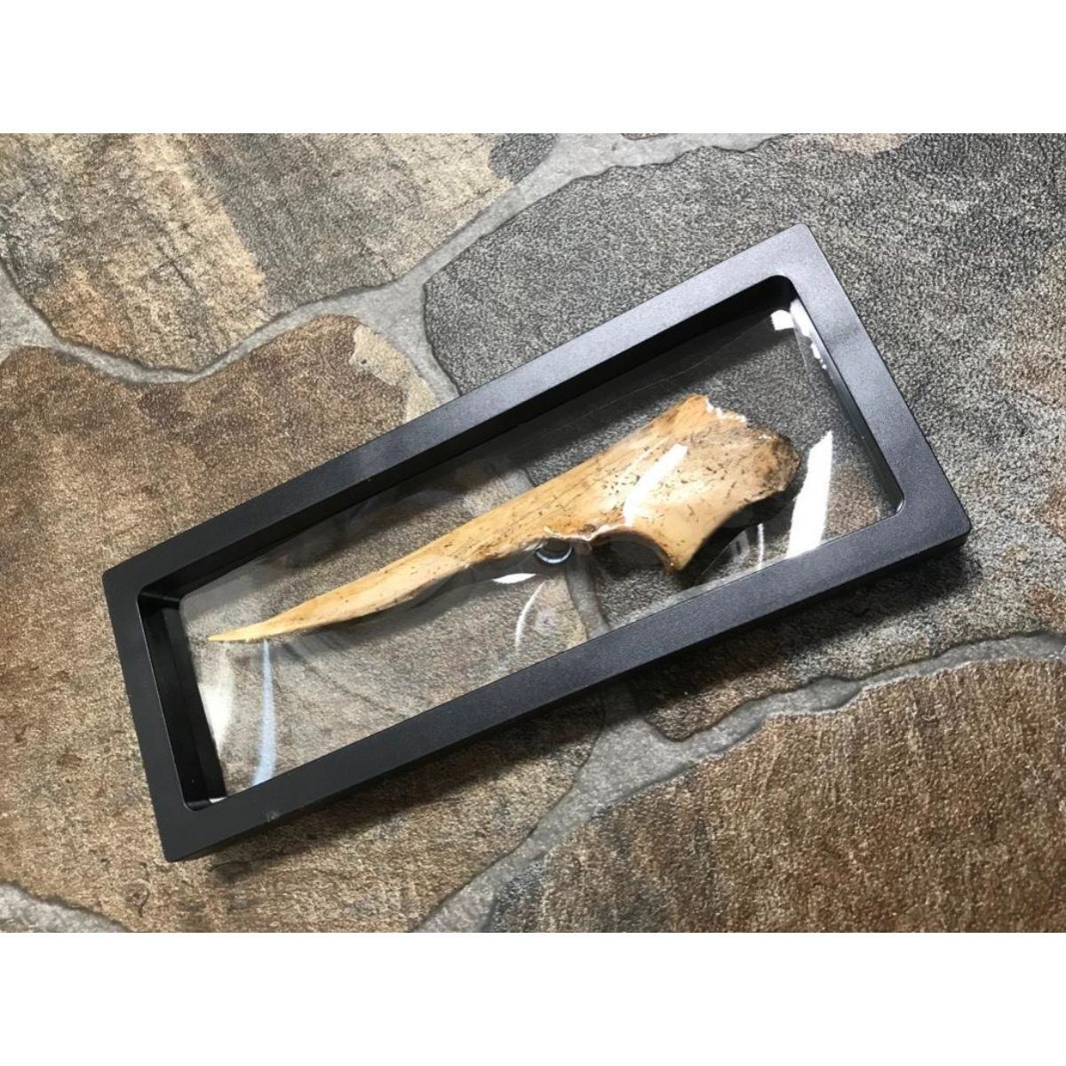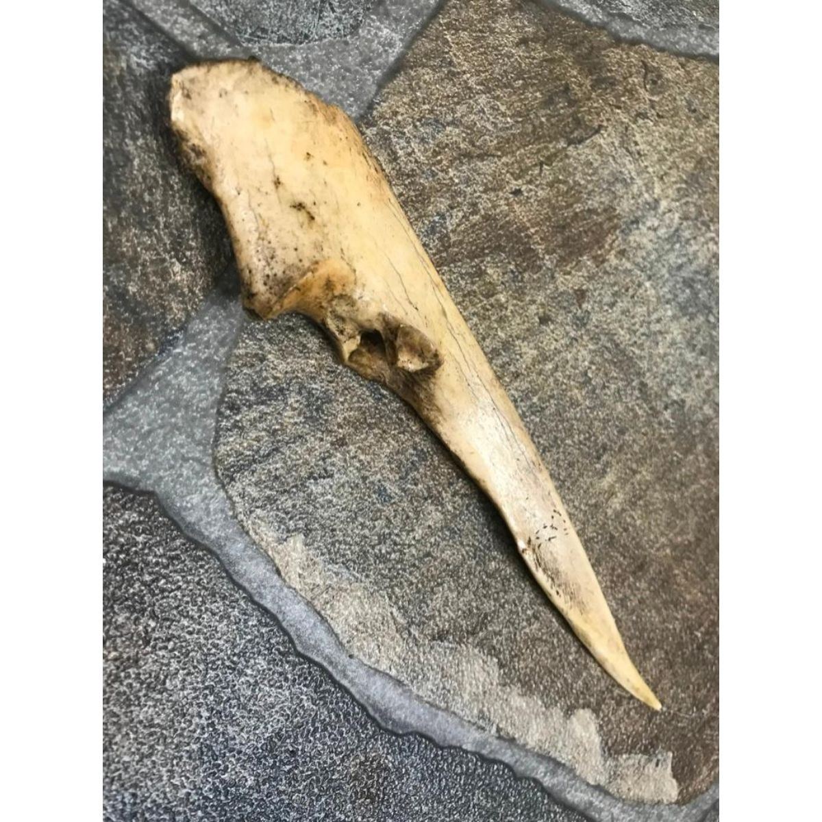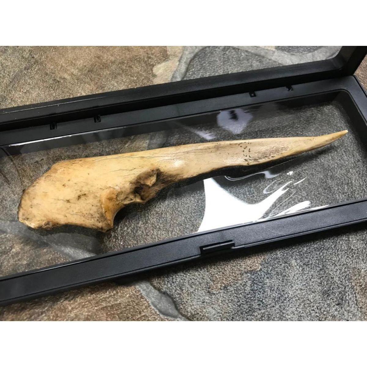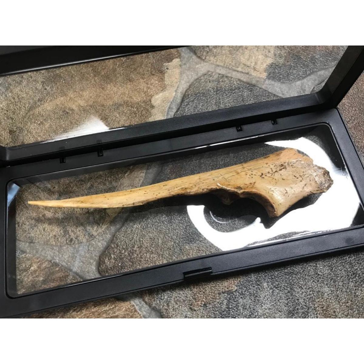 Native American Paleo Indian splinter, trigger animal bone ( most likely deer ) awl tool. 7" L X 1 3/4" W. Comes with museum display case. From a Native American Indian collection in South Carolina. Bone Awls are found at most archaeological sites and were in use throughout all prehistoric periods. Splinter awls are made from bone splinters that were sharpened at one end but remain otherwise without modification. They vary from 3 to 7 inches in length and were generally used to perforate softer materials such as animal hide skins, but may have also been used in making baskets or other types of weaving. Â