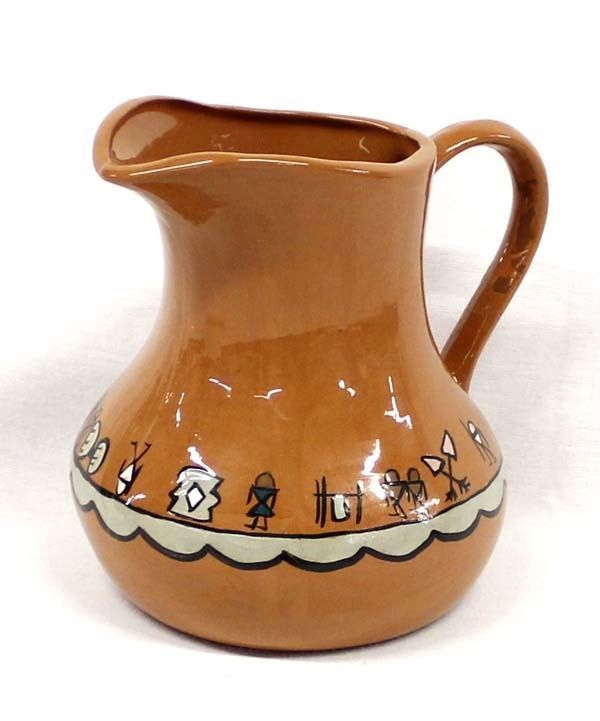 Native American Pamunkey Glazed Ceramic Pottery Pitcher by Pale Moon, measures 7'' x 6'' x 7'' and is signed on the bottom, the Pamunkey Tribe Reservation is located in West Point, Virginia FYI: ''Joyce Pale Moon Krigsvold was born on the Pamunkey Indian Reservation in King William County, Virginia on September 18, 1941. Krigsvold still lives on the Pamunkey Reservation and continues making traditional Pamunkey pottery. She currently can be found nearly every day either managing the Pamunkey Museum or creating new pottery at the Pamunkey Indian Pottery School.''