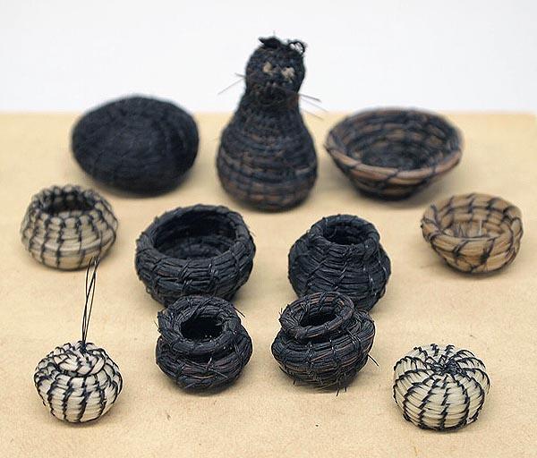 11 Native American Papago Miniature Baskets, 1 lidded and 1 cat, largest measures 1''dia. Buyers Pay Actual Shipping and Handling Charges(see terms and conditions for more information).