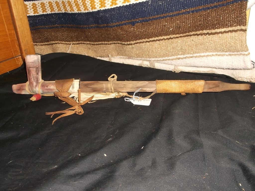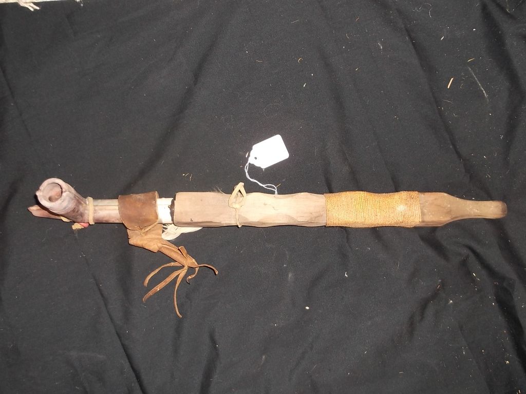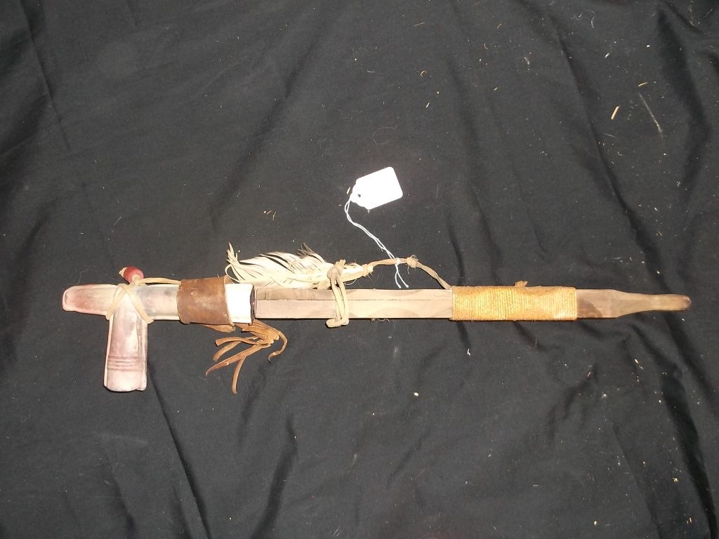 - Wood - String - Leather - Feather 20” long, all natural materials, may have been used. Promote piece with it, hang it on the wall or have a smoke! All sizes approximate