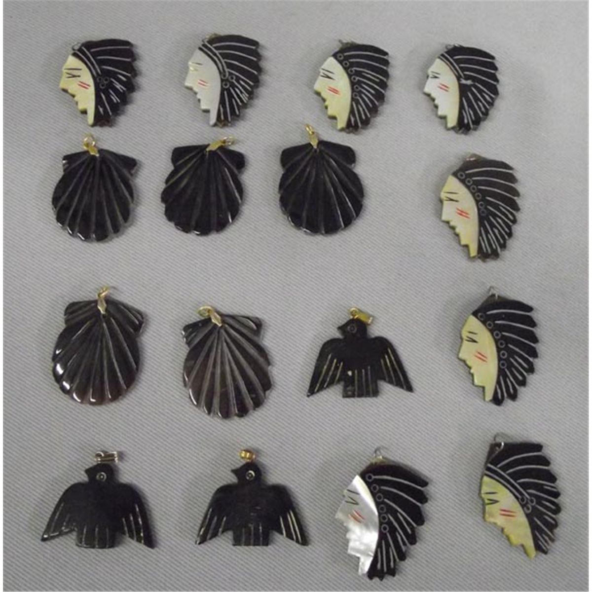 Native American Pendants, Shell & Mother of Pearl. Lot of 16 pieces, pendants, Indian chieftain head, eagles and shell motifs. Buyers Pay Actual Shipping and Handling Charges(see terms and conditions for more information).