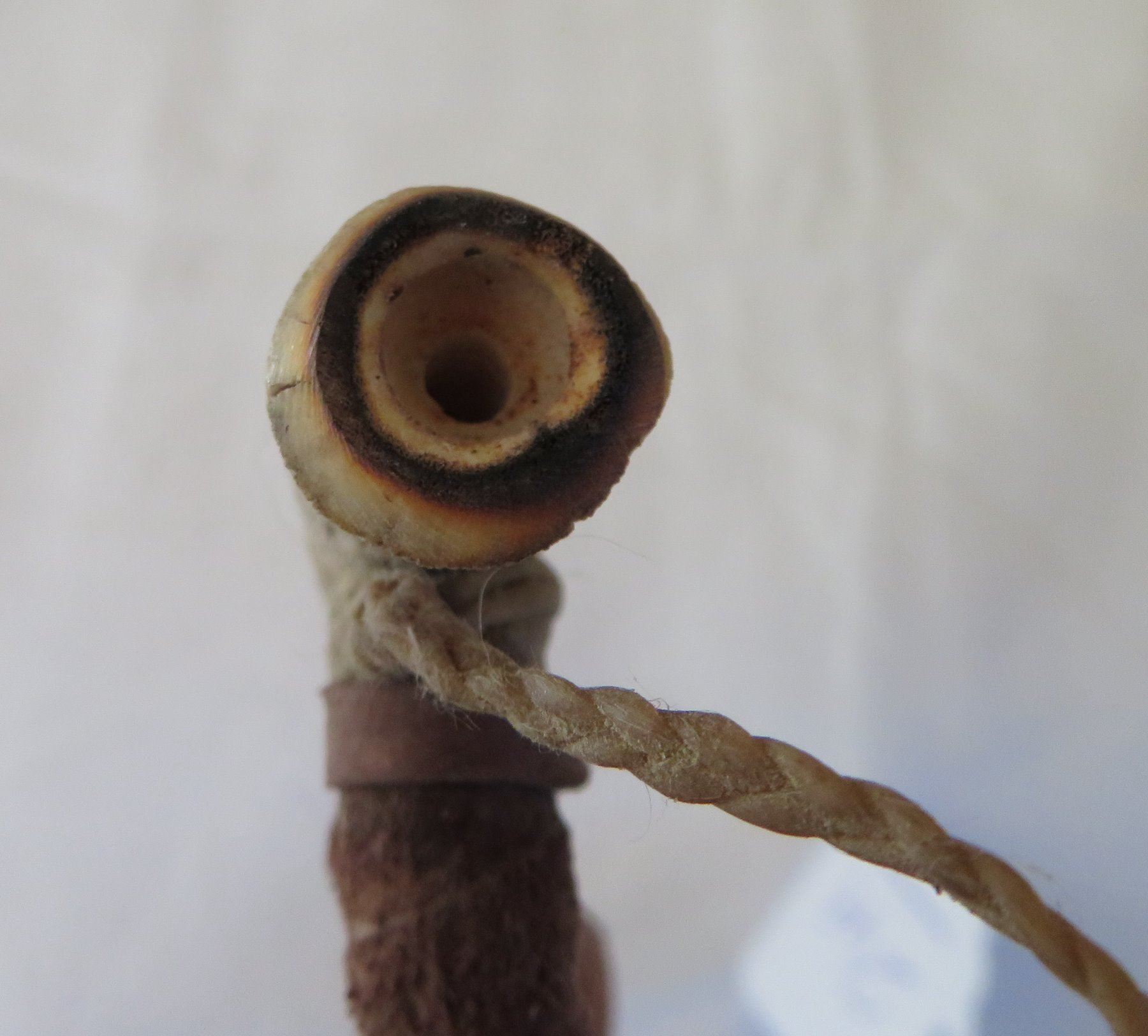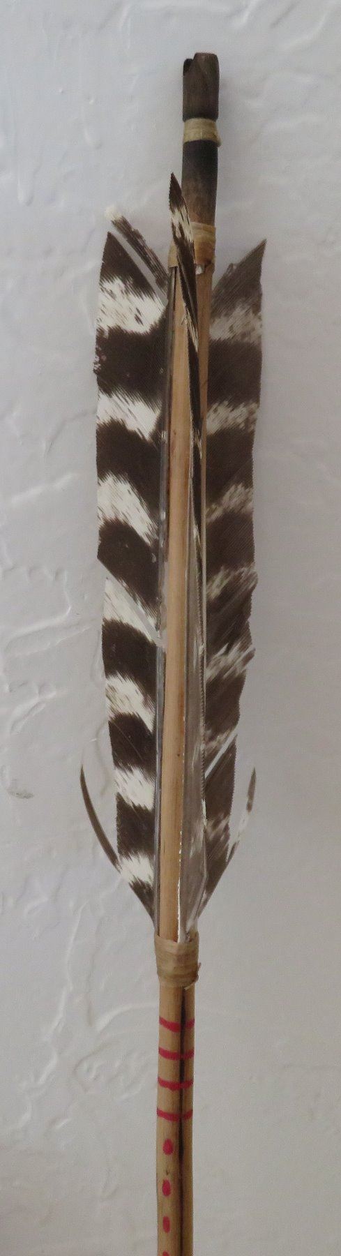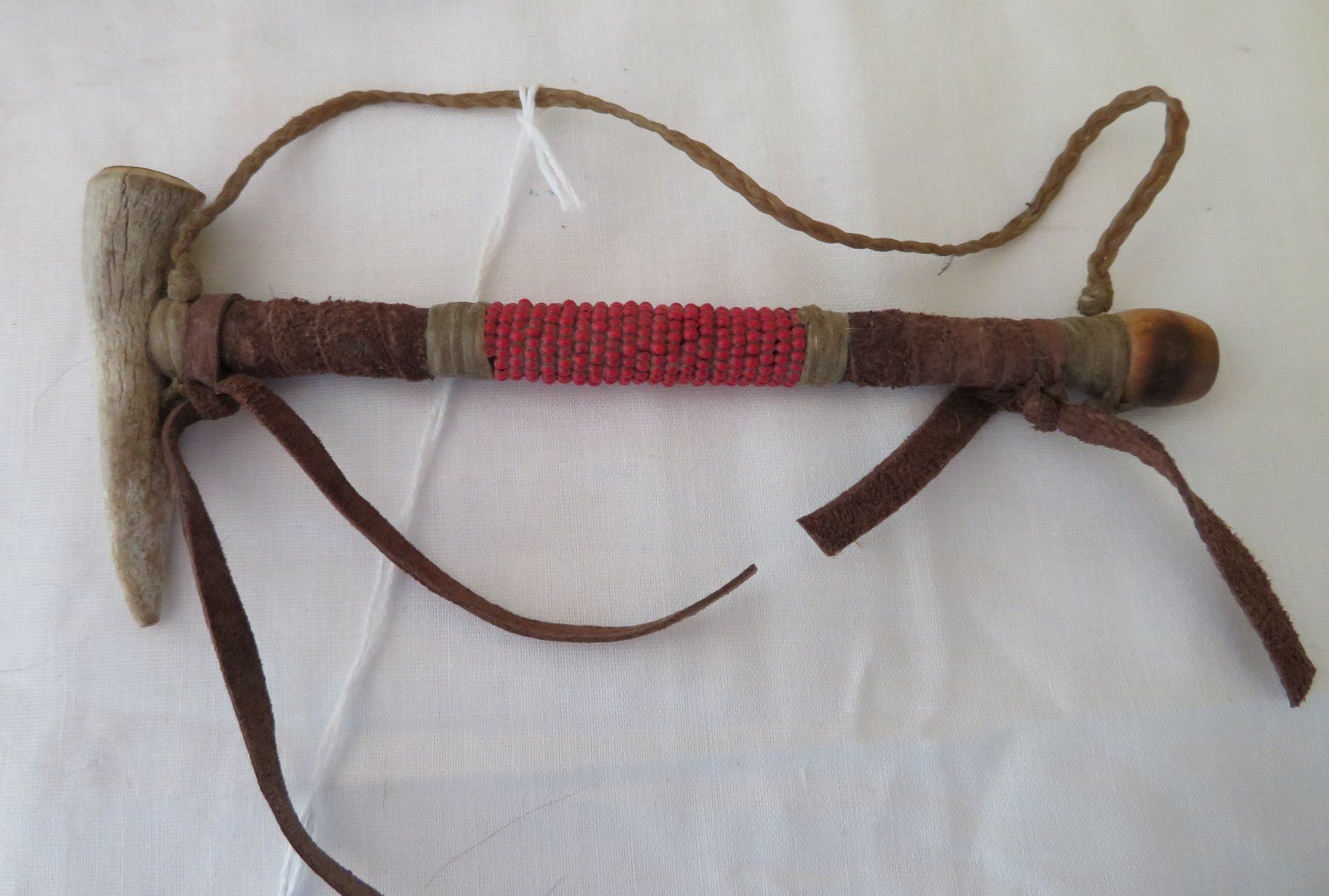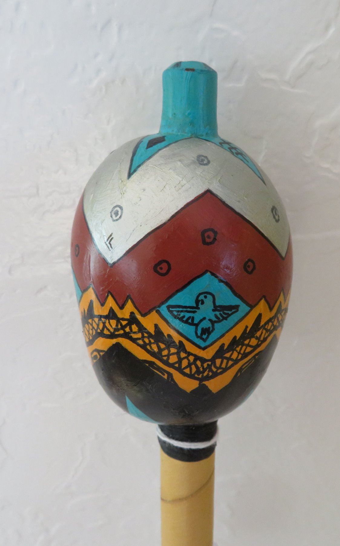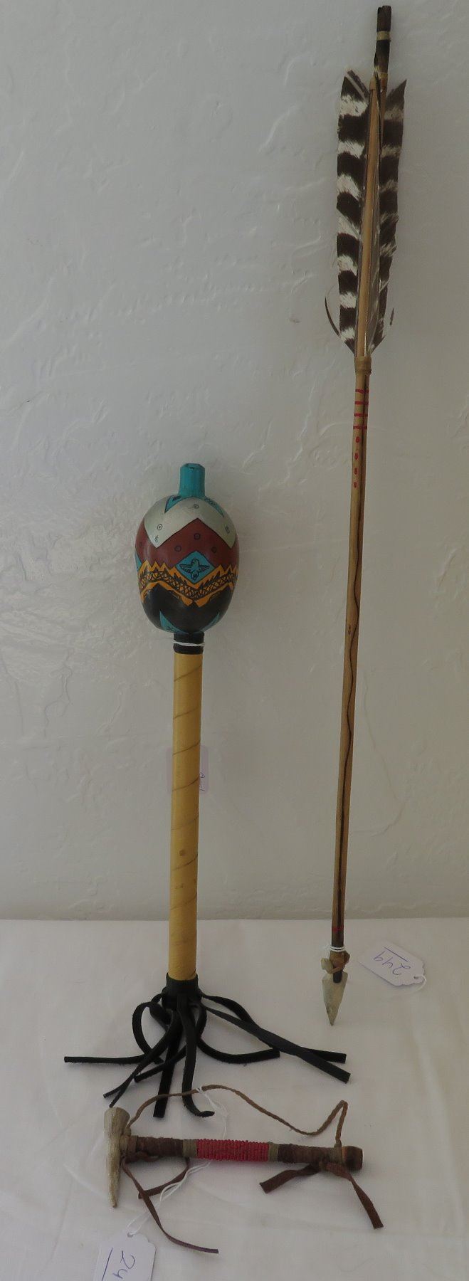 Native American Pipe, Arrow & Rattle, 20th century items. Made of leather, bone, gourd, wood, stone, feathers, glass beads. The items measure from 5.5" to 23" long. Southwest USA. Rattle has great sound and paint; interesting pipe which appears to have been smoked. Nice old arrow with bone point. Condition: Good, some wear, see images. Shipping: $28.50 w/insurance and signature, due to length.