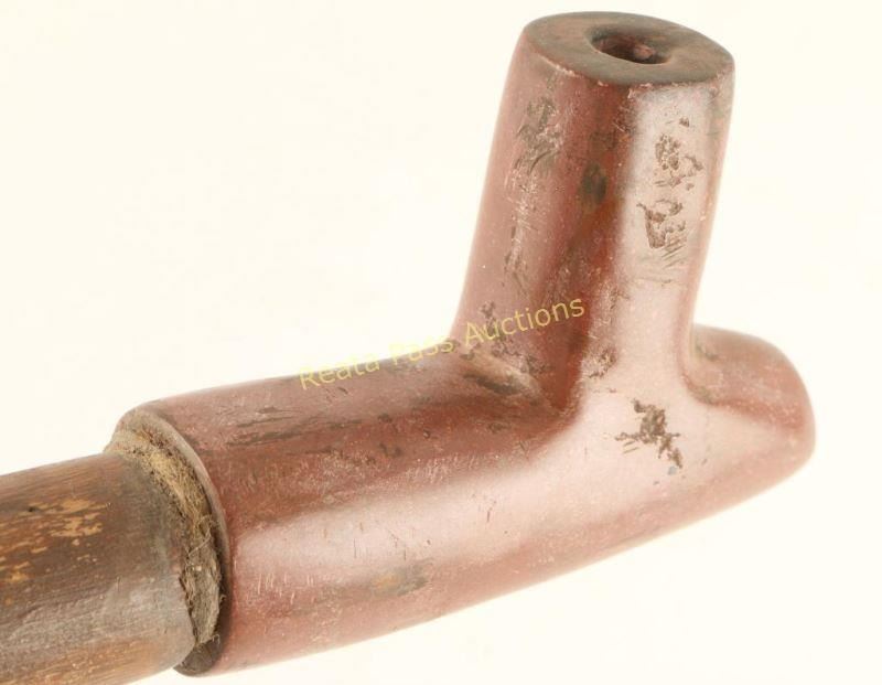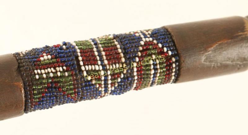 Handmade catlanite pipe bowl with a wood carved stem accented with colorful trade beads. Measures 22 1/2" overall, shows age and has some losses to stem.