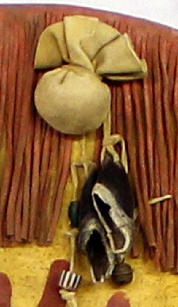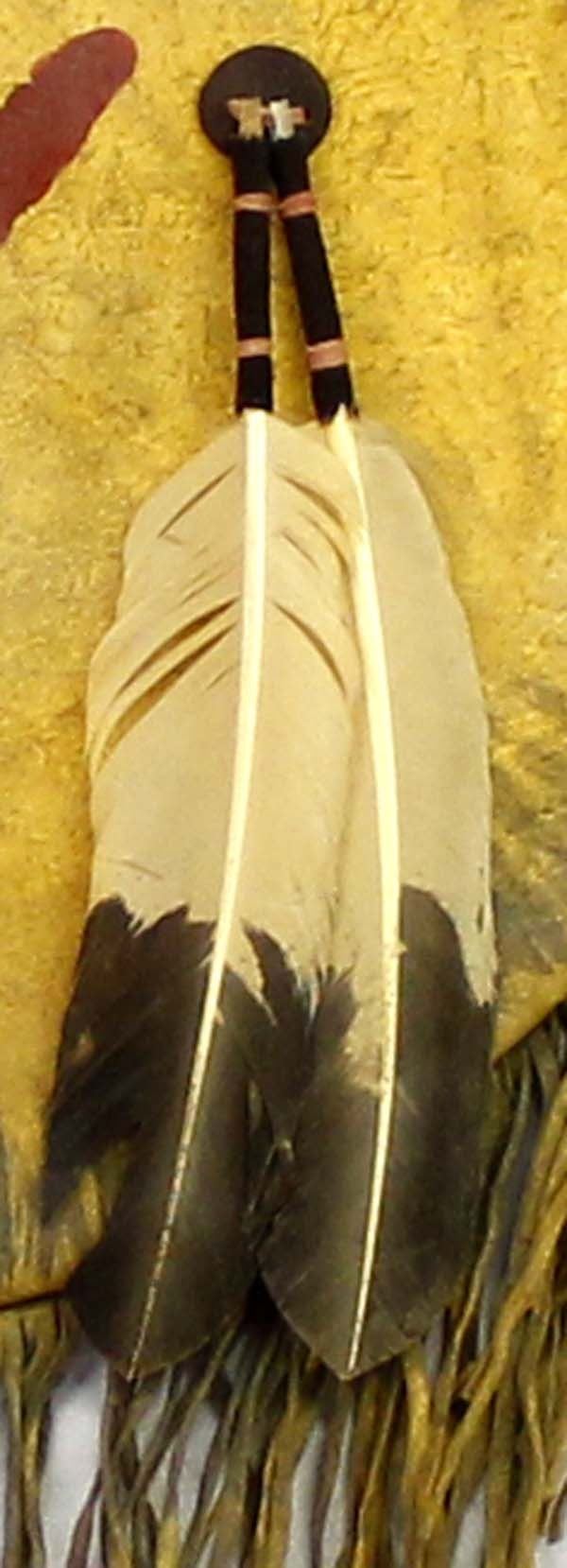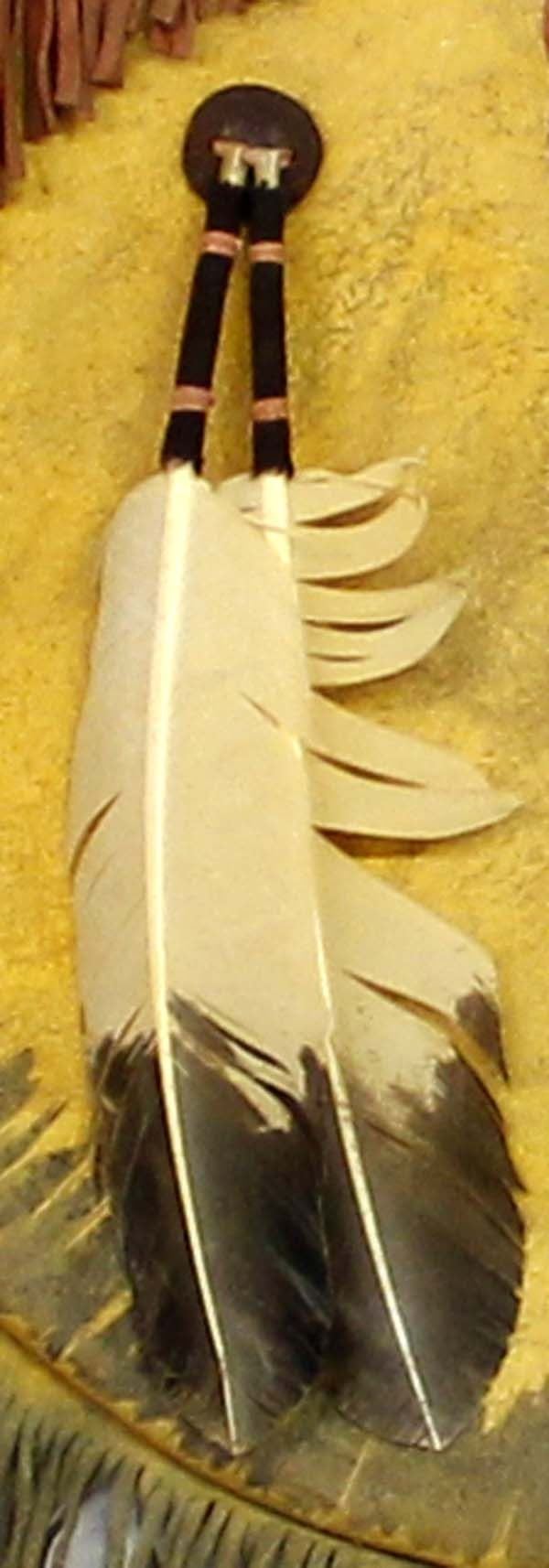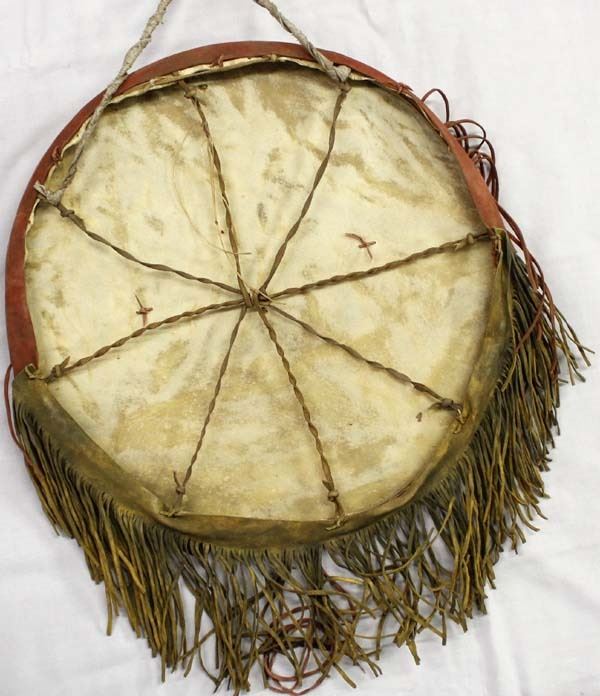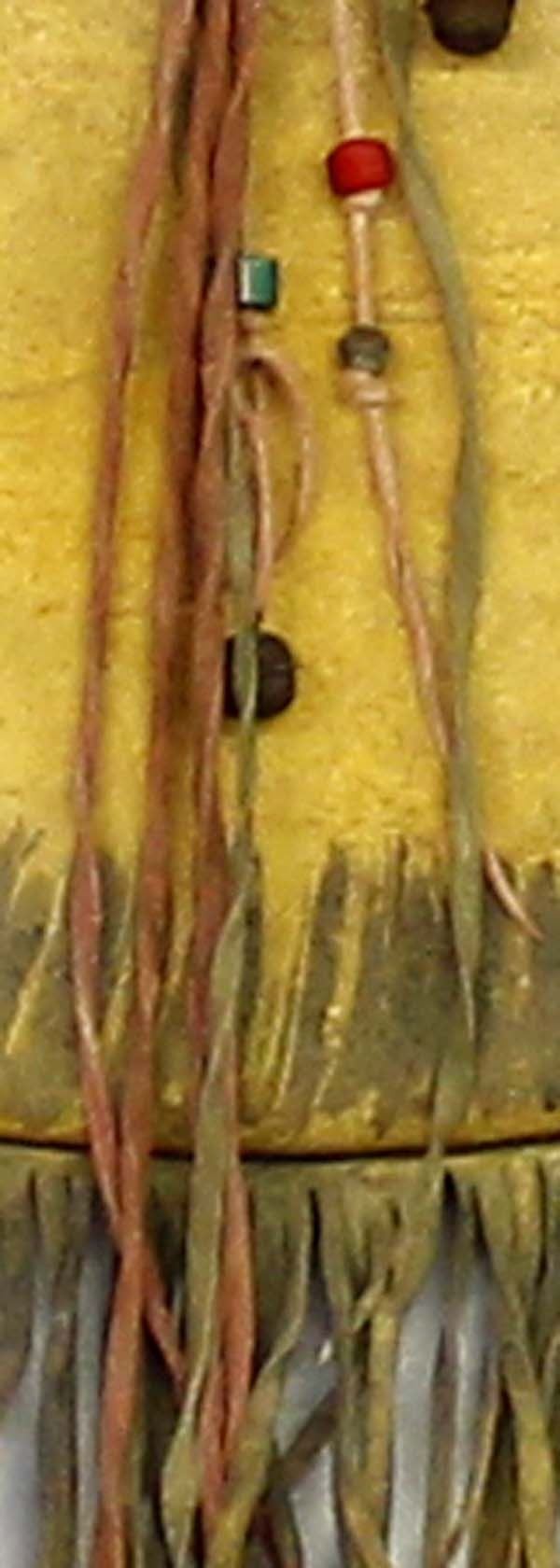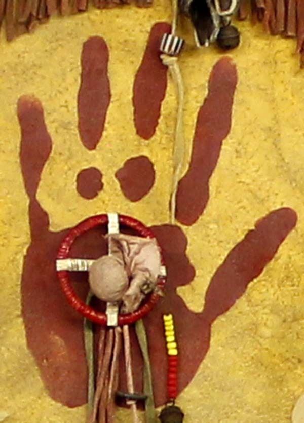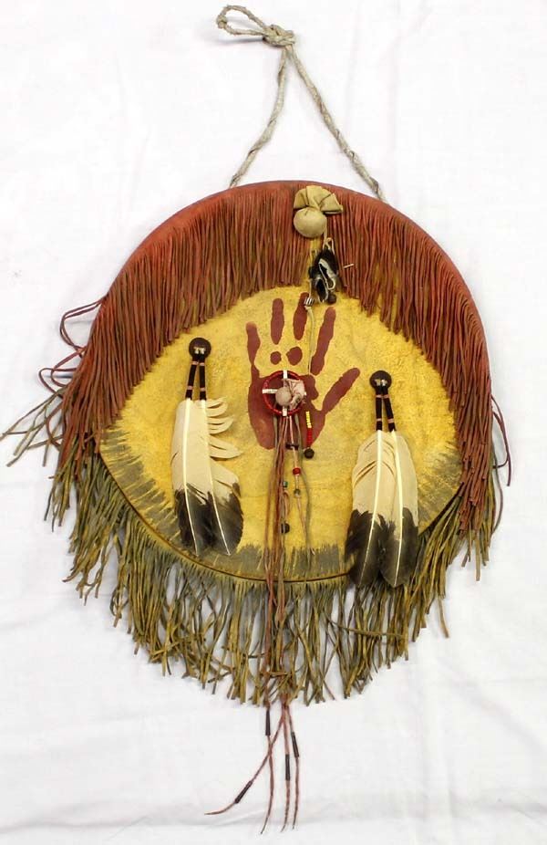 Native American Plains Indian Parfleche and Fringed Leather Banner, measures 47''L x 21''D, embellished with turkey feathers, deer hooves, 2 medicine bundles, porcupine quill medicine wheel, antique brass bells, tin cones, red heart bead, abalone, old trade beads, in the center of the banner is a large red painted hand, there is also black painted lines along the edge
