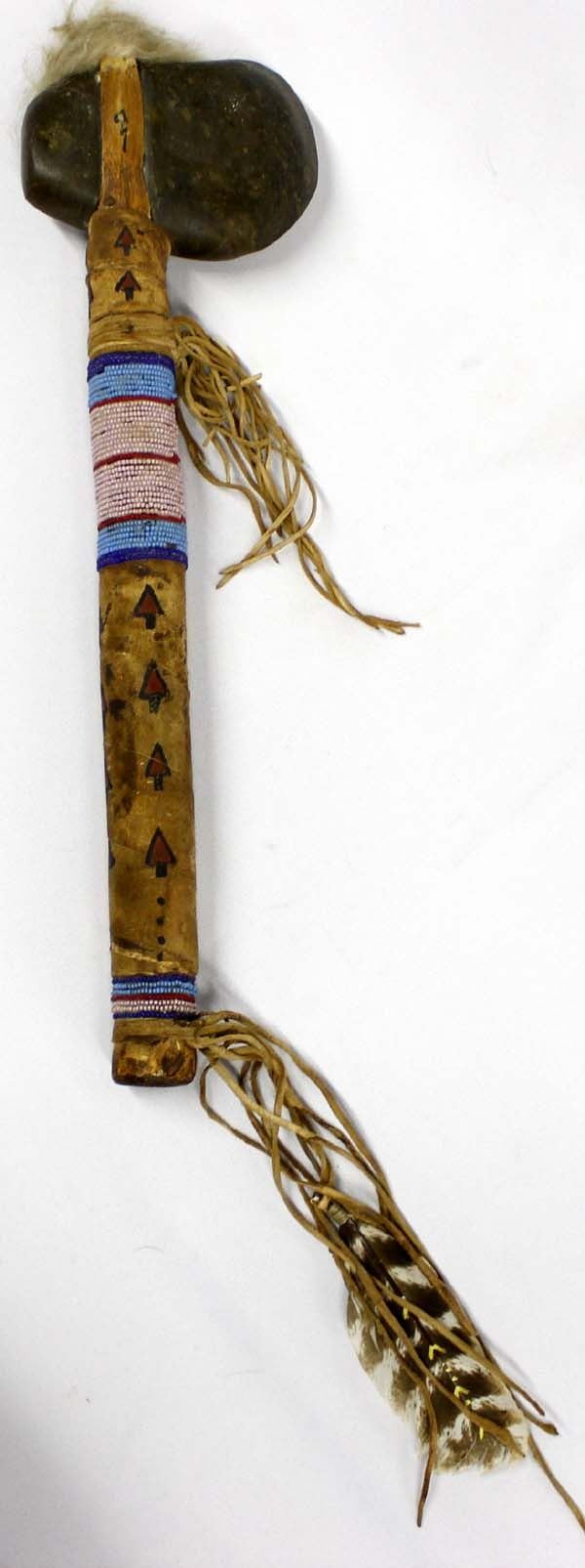 Native American Plains Indian Stone Club, beaded hand painted leather wrapped handle, embellished with fur and fringed leather, measures 5'' x 17'' x 2''