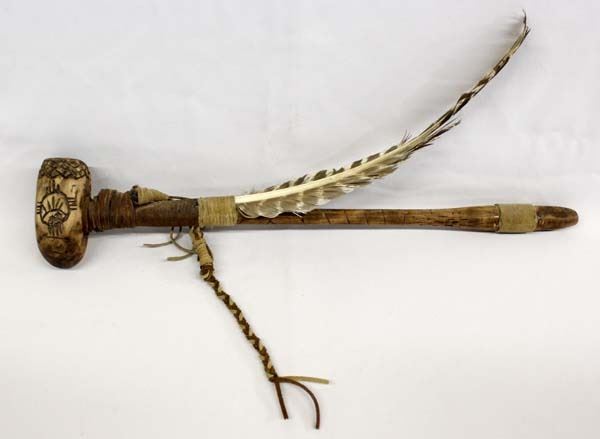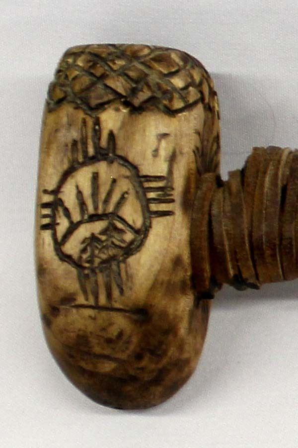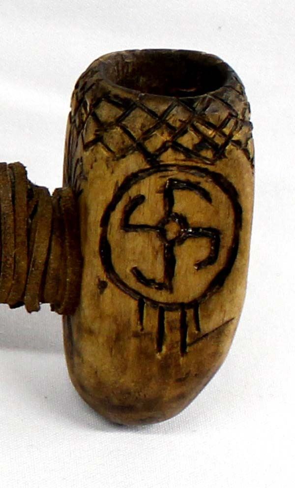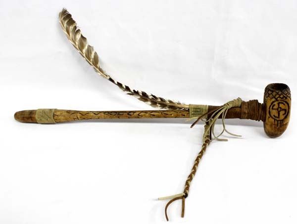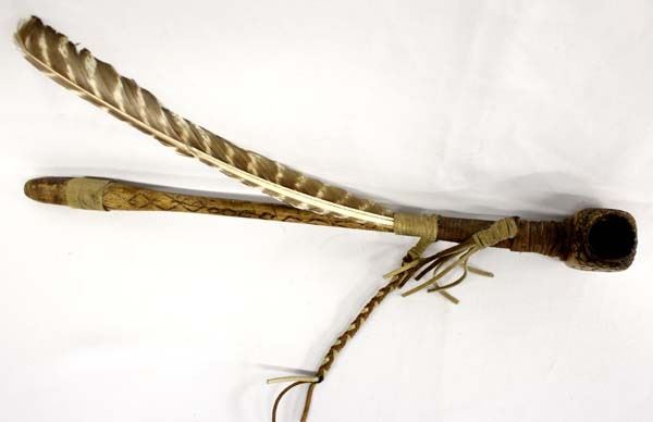 Native American Plains Indian Wooden Pipe, measures 20''L x 3.75''H, embellished with leather and a large turkey feather, has wood burned designs including a Zia (directional) symbol, rolling log, and wind