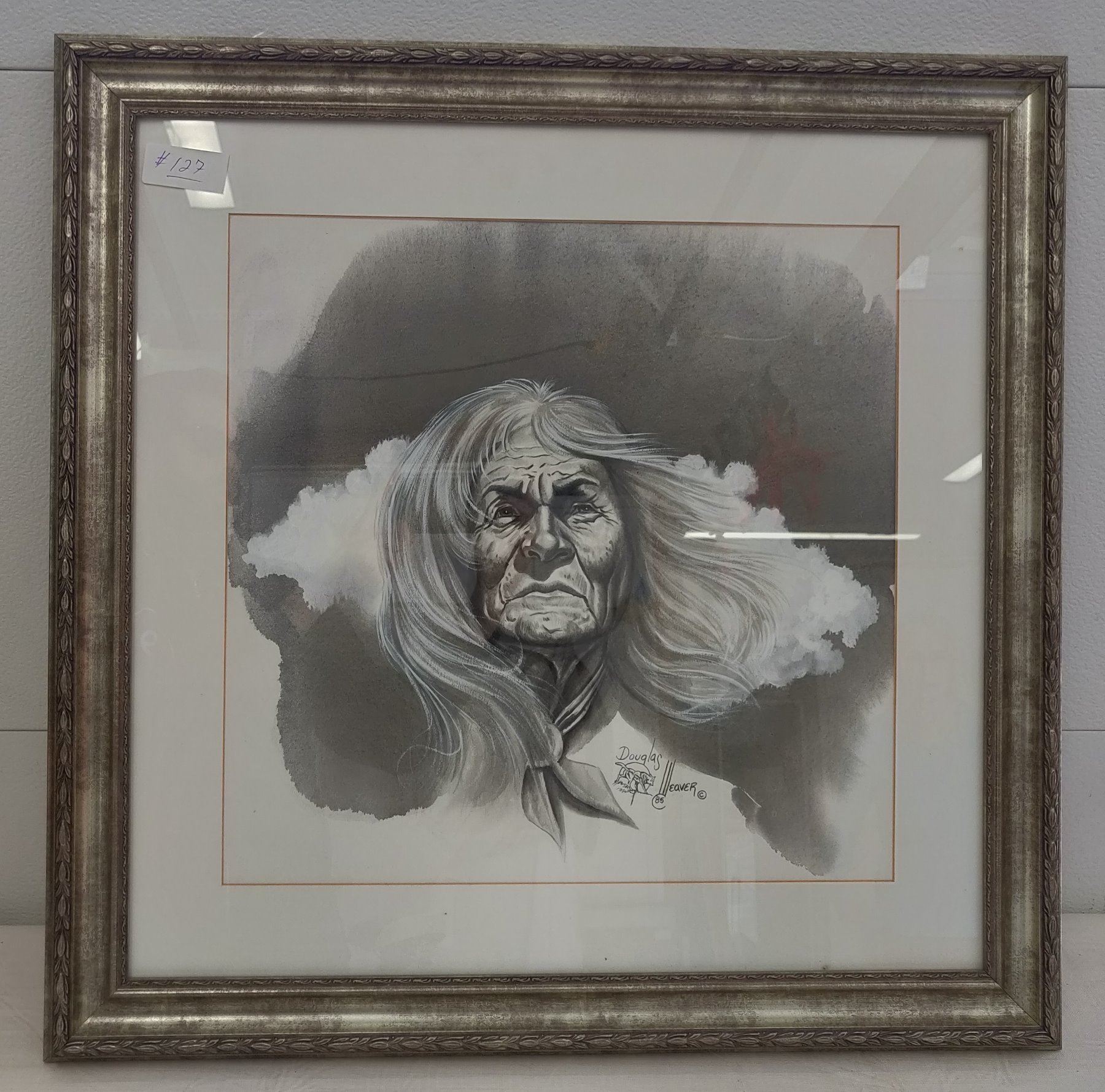 Native American Portrait by Douglas Weaver, c. 1985. Made of wood and glass, this item appears to be a watercolor measuring 17" x 17". Signed and dated by the late, Douglas Weaver. Condition: Good, see images. Shipping: $100.00 USA estimate only, due to size, weight and value, w/insurance and signature. Local pick-up preferred.
