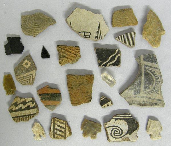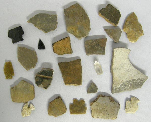 Collection of Pot Sherds, Arrowhead Chips, plus Crystal. The largest sherd measures approx. 3''x2.5''. Buyers Pay Actual Shipping and Handling Charges(see terms and conditions for more information).