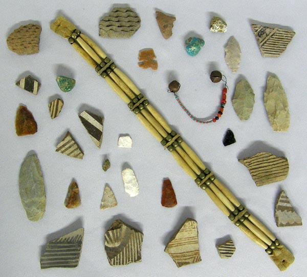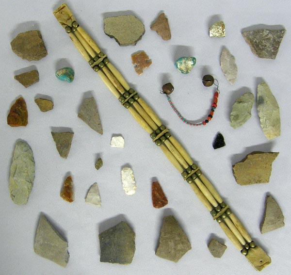 Native American Pot Sherds, Necklace, Turquoise, Arrowhead Chips and More. The largest sherd measures approx. 1.75''x1.5'', the necklace measures approx. 13''Lx.75''W. Buyers Pay Actual Shipping and Handling Charges(see terms and conditions for more information).