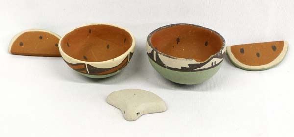 Native American Pottery Watermelon Bowls and Watermelon Slices, largest measures 2.5'' x 1.5'', the vintage bowl has a large chip in the rim
