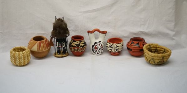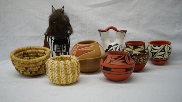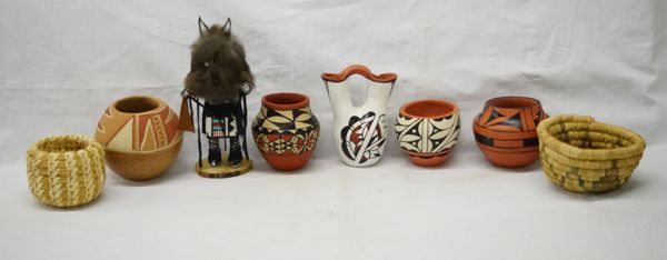 Native American Pueblo Pottery, Baskets, & Kachina, #1 Tohono O'odham Split Stitch Basket #2 Vintage Tri-Color Pima Basket #3 Jemez Polychrome Jar by Delcie Toya #4 San Juan Polychrome Jar #5 Jemez Polychrome Jar by M. M. Toya #6 Jemez Polychrome Wedding Vase by Clara Chosa #7 Jemez Jar by Francis Waquiu #8 Navajo Wolf Kachina by Thompson