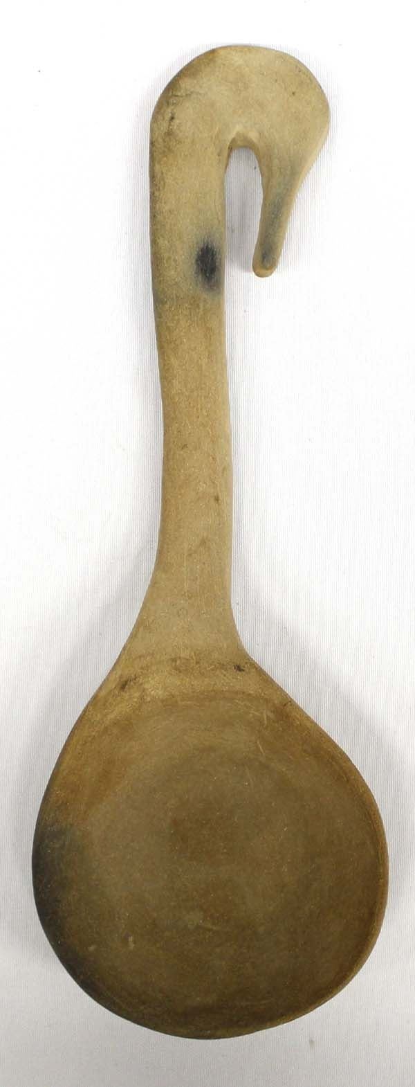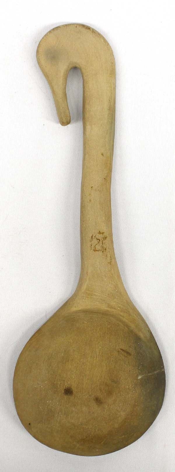 Native American Pueblo Pottery Ladle, measures 4.5'' x 13''L, bird design handle, fire clouds present